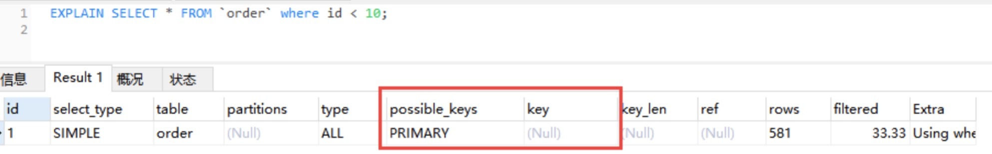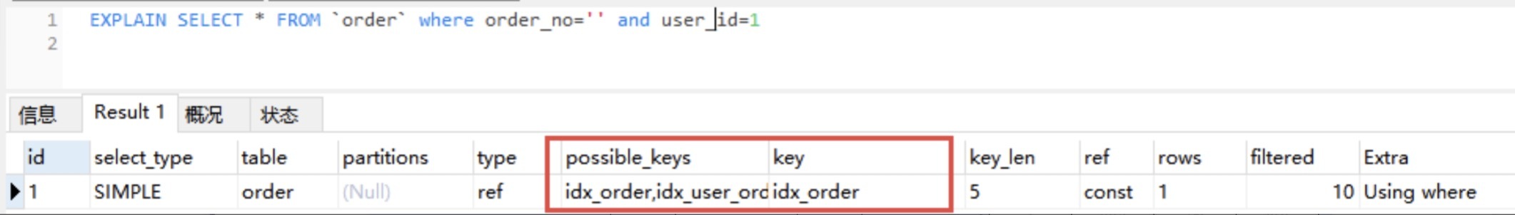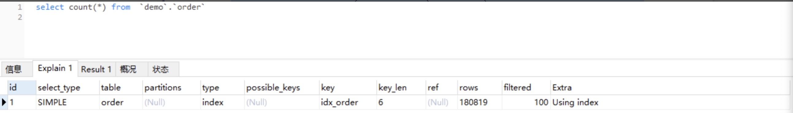 通过EXPLAIN,我们可以看到 InnoDB 存储引擎使用了idx_order索引列来统计行数,如下图所示: