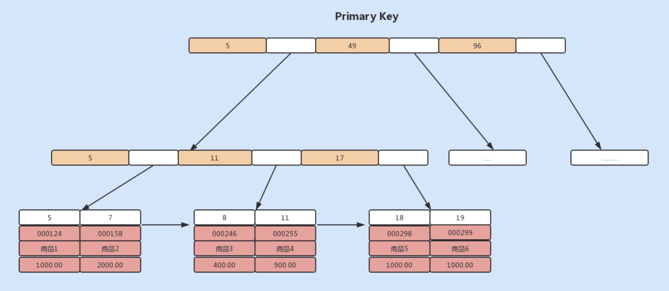 如果我们使用主键索引查询商品,则会按照B+树的索引找到对应的叶子节点,直接获取到行数据:
