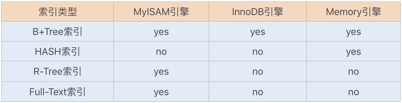 索引是优化数据库查询最重要的方式之一,它是在MySQL的存储引擎层中实现的,所以每一种存储引擎对应的索引不一定相同。我们可以通过下面这张表格,看看不同的存储引擎分别支持哪种索引类型: