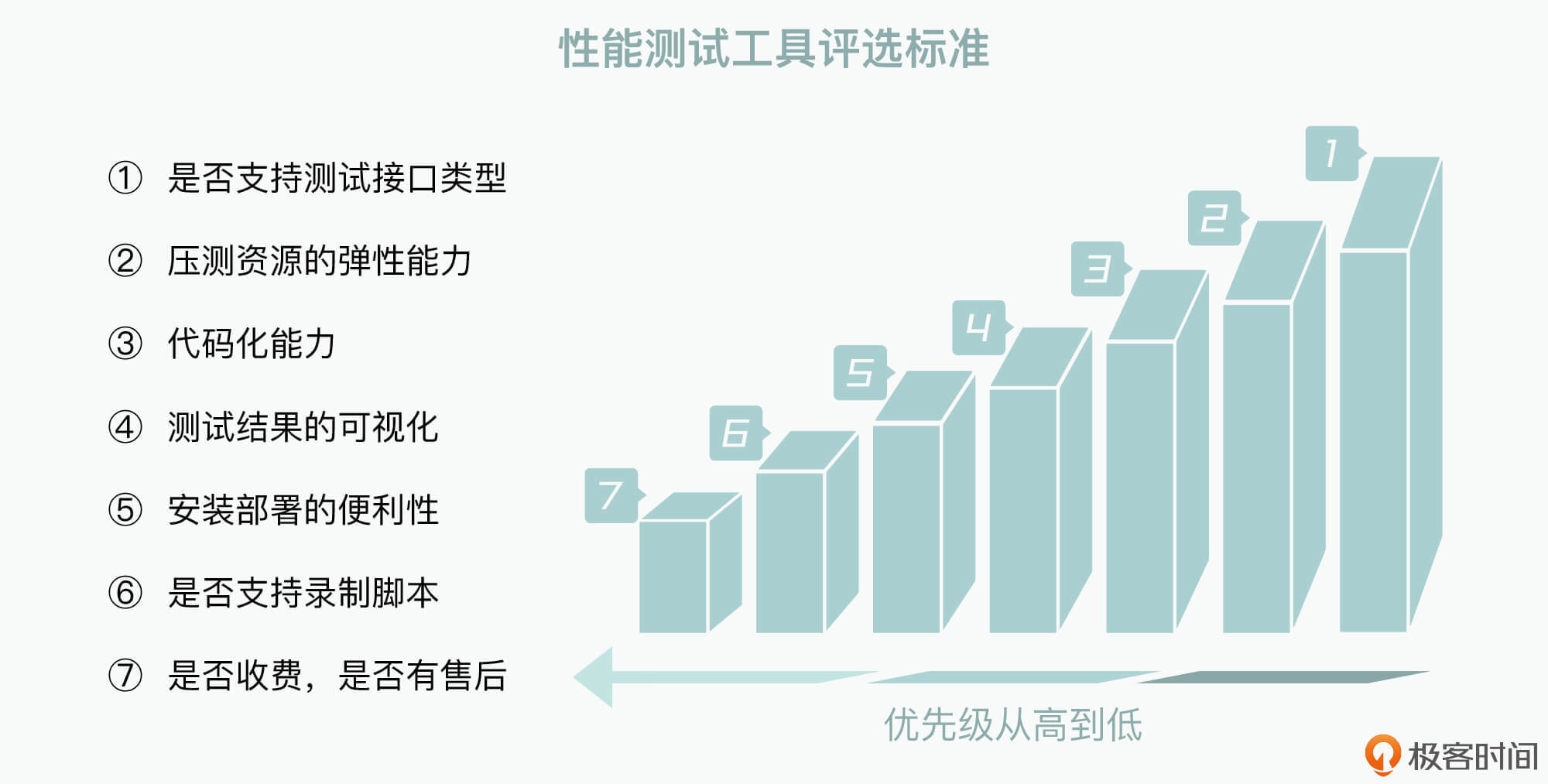 那么为了更好地实现这个目标,依据我在性能测试中积累的实践经验,我给你总结了一些很实用的评选参考标准,你可以基于这些标准来选择性能测试工具,这样就可以更好地把测试工作和开发工作结合起来,进一步也就可以帮助团队之间进行良好的协作了: