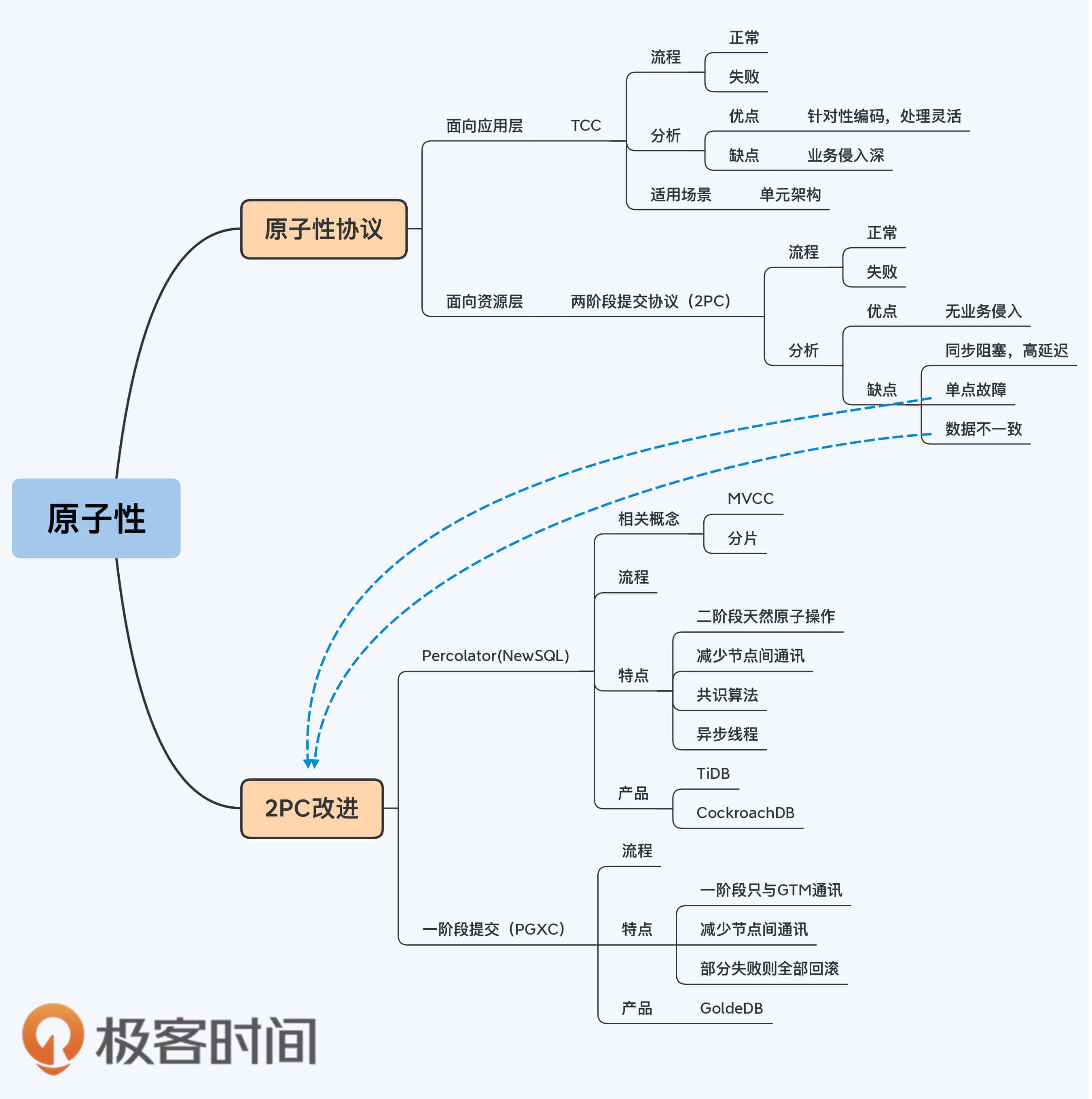 事实上,多数分布式数据库都是在2PC协议基础上改进,来保证分布式事务的原子性。这里我挑选了两个有代表性的2PC改进模型和你展开介绍,它们分别来自分布式数据库的两大阵营,NewSQL和PGXC。