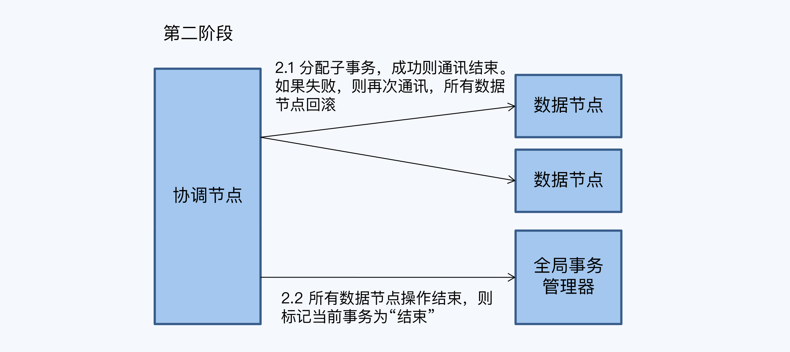 第二阶段,协调节点把一个全局事务分拆成若干子事务,分配给对应的MySQL去执行。如果所有操作成功,协调者节点会将全局事务列表中的事务标记为结束,整个事务处理完成。如果失败,子事务在单机上自动回滚,而后反馈给协调者节点,后者向所有数据节点下发回滚指令。