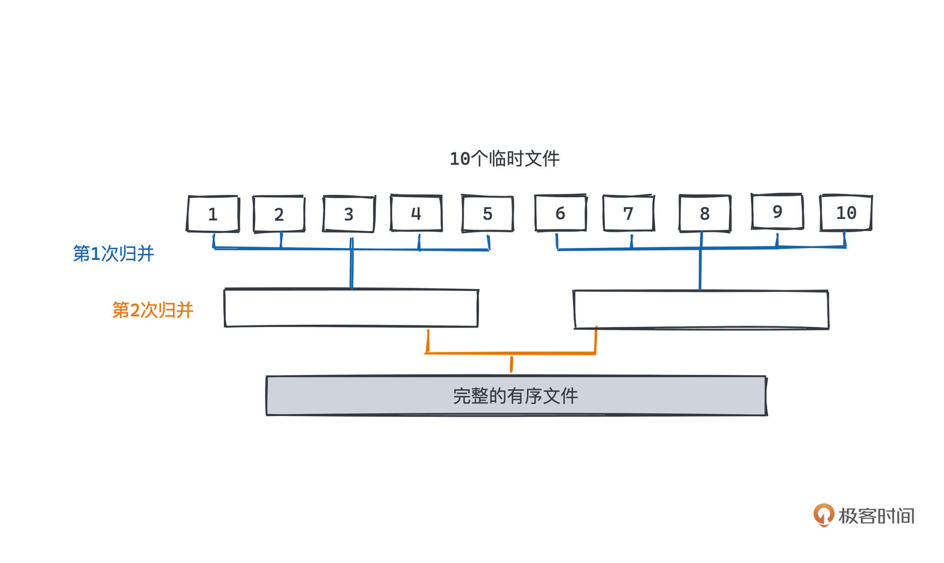 其实你会发现我们刚刚描述的想法和归并排序如出一辙,归并排序也是常用的外排实现方式,只不过我们在学习它的时候,一般都是针对数组,也就是在内存中排序的场景。