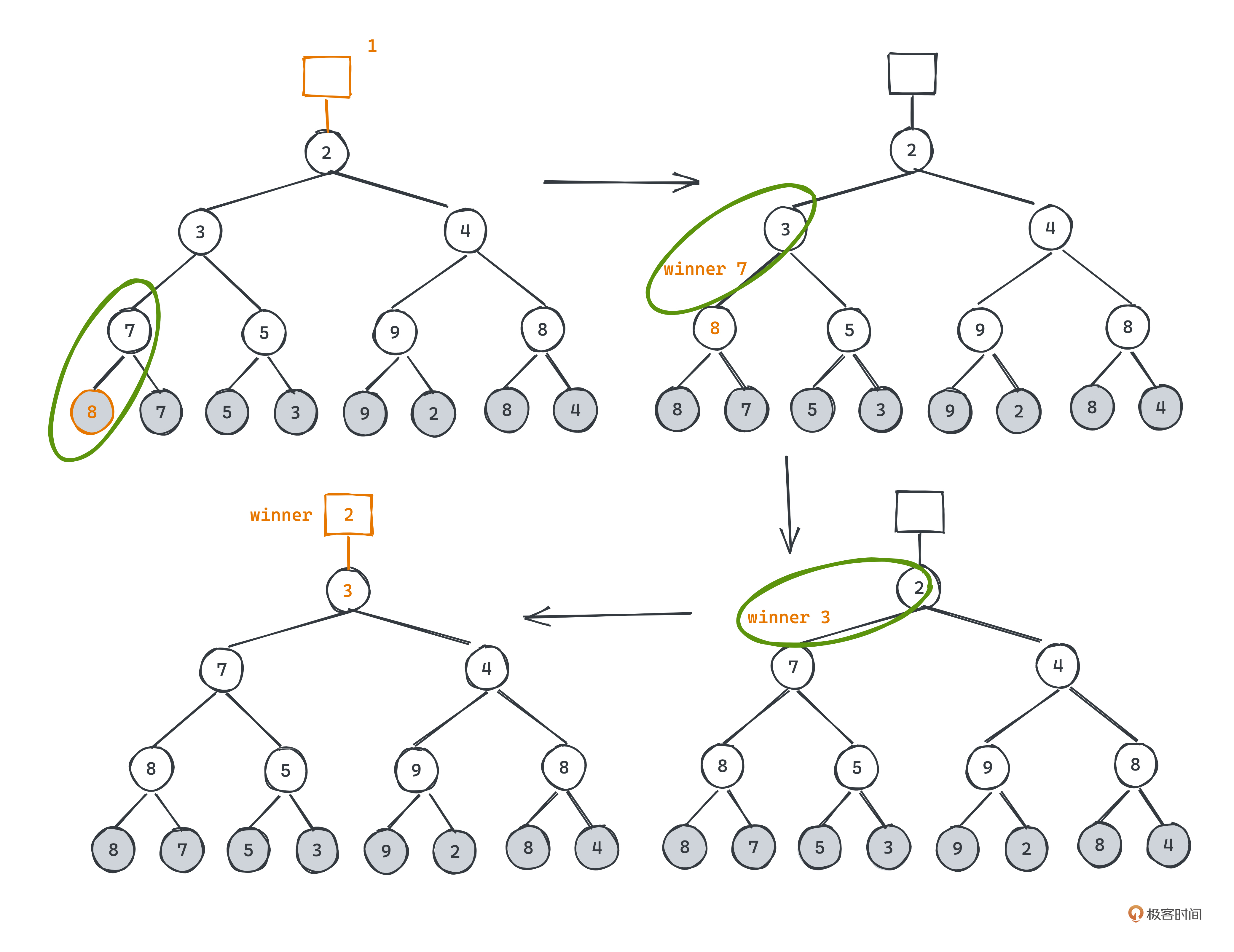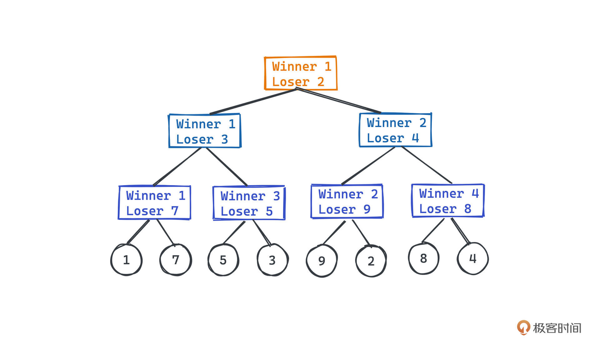 至于为什么在节点中存储的是失败者,而不是获胜者呢?就留给你做课后思考题啦。事实上,在父节点中存储获胜者的树也是存在的,和你想的一样,我们也称之为胜者树。