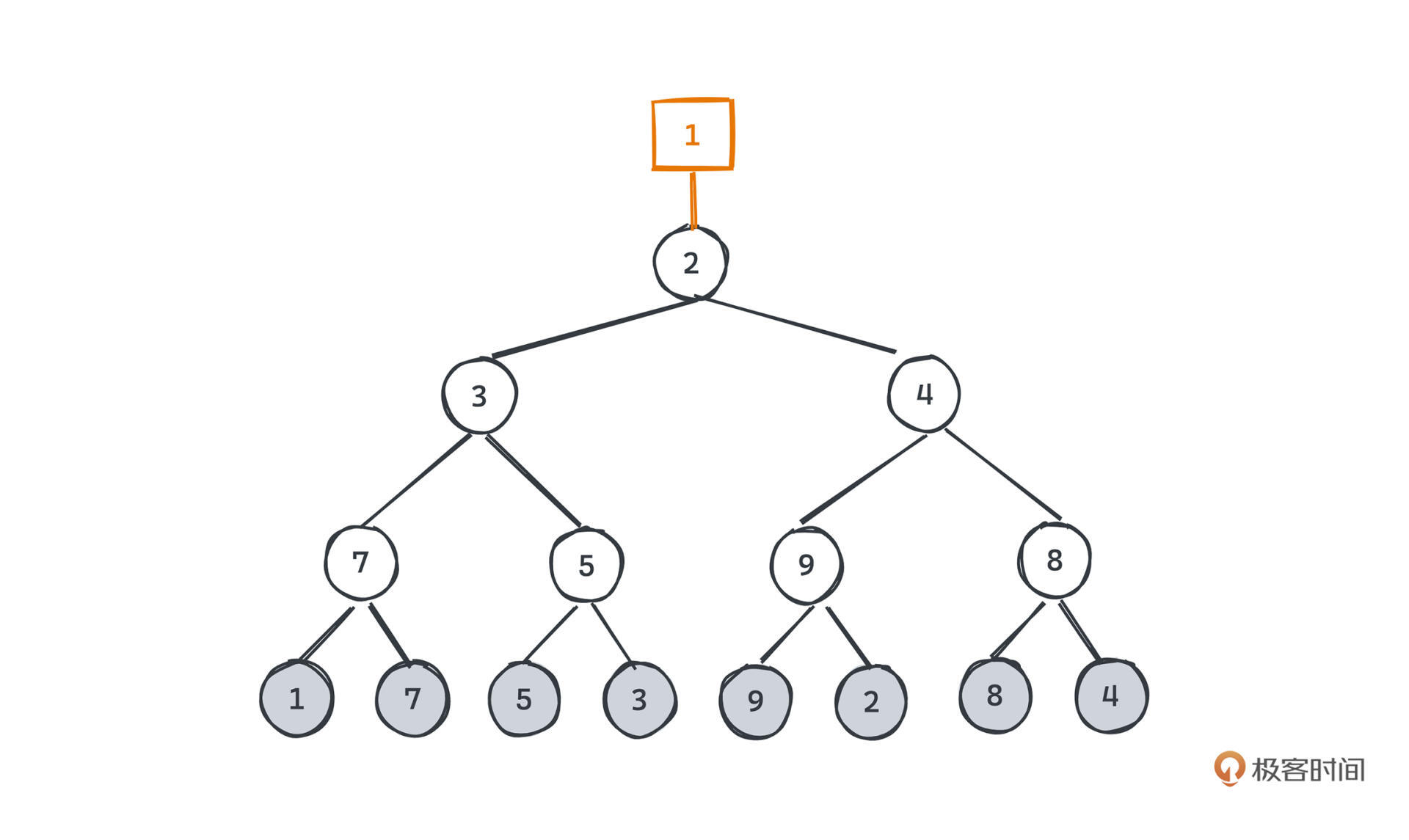 因为原来的获胜者已经被取走了,这里的父节点现在存储的其实就是这颗子树中原来的亚军,如果我们要看这次新来的选手能否能成为新的冠军,只需要和原来的亚军进行一次比较即可;当然这次比较结束后,两者中的胜者还需要到更上一层继续比较。