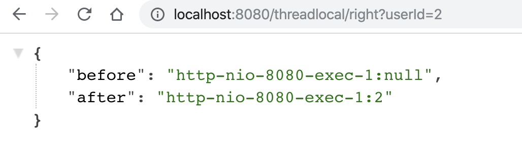 1 2 3 4 5 6 7 8 9 10 11 12 13 14 15 16 17 18 private static final ThreadLocal<Integer> currentUser = ThreadLocal.withInitial(() -> null); @GetMapping("wrong") public Map wrong(@RequestParam("userId") Integer userId) { //设置用户信息之前先查询一次ThreadLocal中的用户信息 String before = Thread.currentThread().getName() + ":" + currentUser.get(); //设置用户信息到ThreadLocal currentUser.set(userId); //设置用户信息之后再查询一次ThreadLocal中的用户信息 String after = Thread.currentThread().getName() + ":" + currentUser.get(); //汇总输出两次查询结果 Map result = new HashMap(); result.put("before", before); result.put("after", after); return result; }