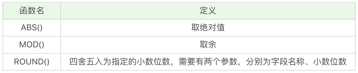 算术函数,顾名思义就是对数值类型的字段进行算术运算。常用的算术函数及含义如下表所示: