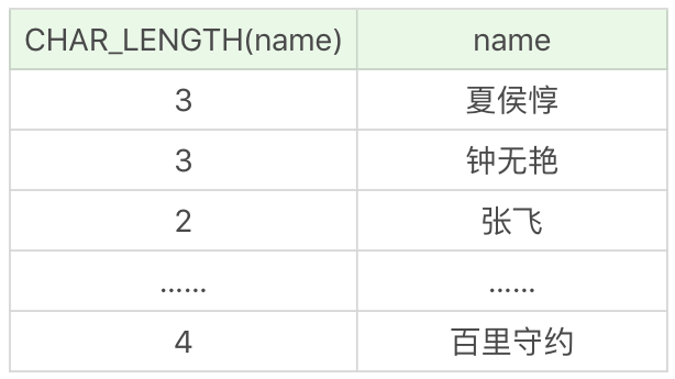 假如我们想显示英雄的名字,以及他们的名字字数,需要用到CHAR_LENGTH函数。