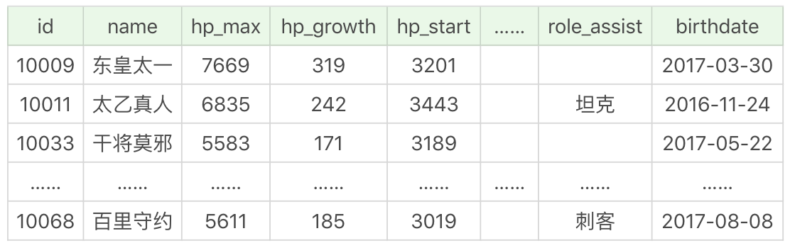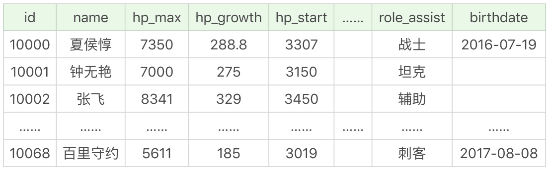 我创建了一个王者荣耀英雄数据库,一共有69个英雄,23个属性值。SQL文件见Github地址:https://github.com/cystanford/sql_heros_data。