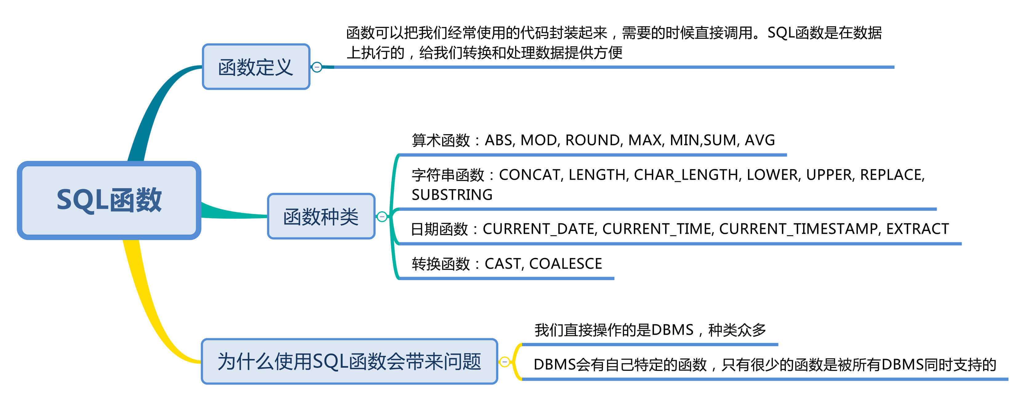 函数对于一门语言的重要性毋庸置疑,我们在写Python代码的时候,会自己编写函数,也会使用Python内置的函数。在SQL中,使用函数的时候需要格外留意。不过如果工程量不大,使用的是同一个DBMS的话,还是可以使用函数简化操作的,这样也能提高代码效率。只是在系统集成,或者在多个DBMS同时存在的情况下,使用函数的时候就需要慎重一些。