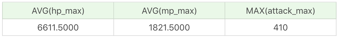 假设我们需要知道在2016年10月1日之后上线英雄的平均最大生命值、平均最大法力和最高物攻最大值。同样我们需要先筛选日期条件,即WHERE DATE(birthdate)>'2016-10-01',然后再选择AVG(hp_max), AVG(mp_max), MAX(attack_max)字段进行显示。