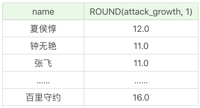 代码中,ROUND(attack_growth,1)中的attack_growth代表想要处理的数据,“1”代表四舍五入的位数,也就是我们这里需要精确到的位数。