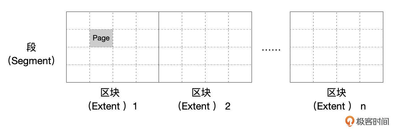InnoDB中,表的数据以聚簇索引的方式,存储在一个数据段(Segment)中,一个数据段由一系列区块(Extent)组成。每个区块由64个16K的连续的页面组成。