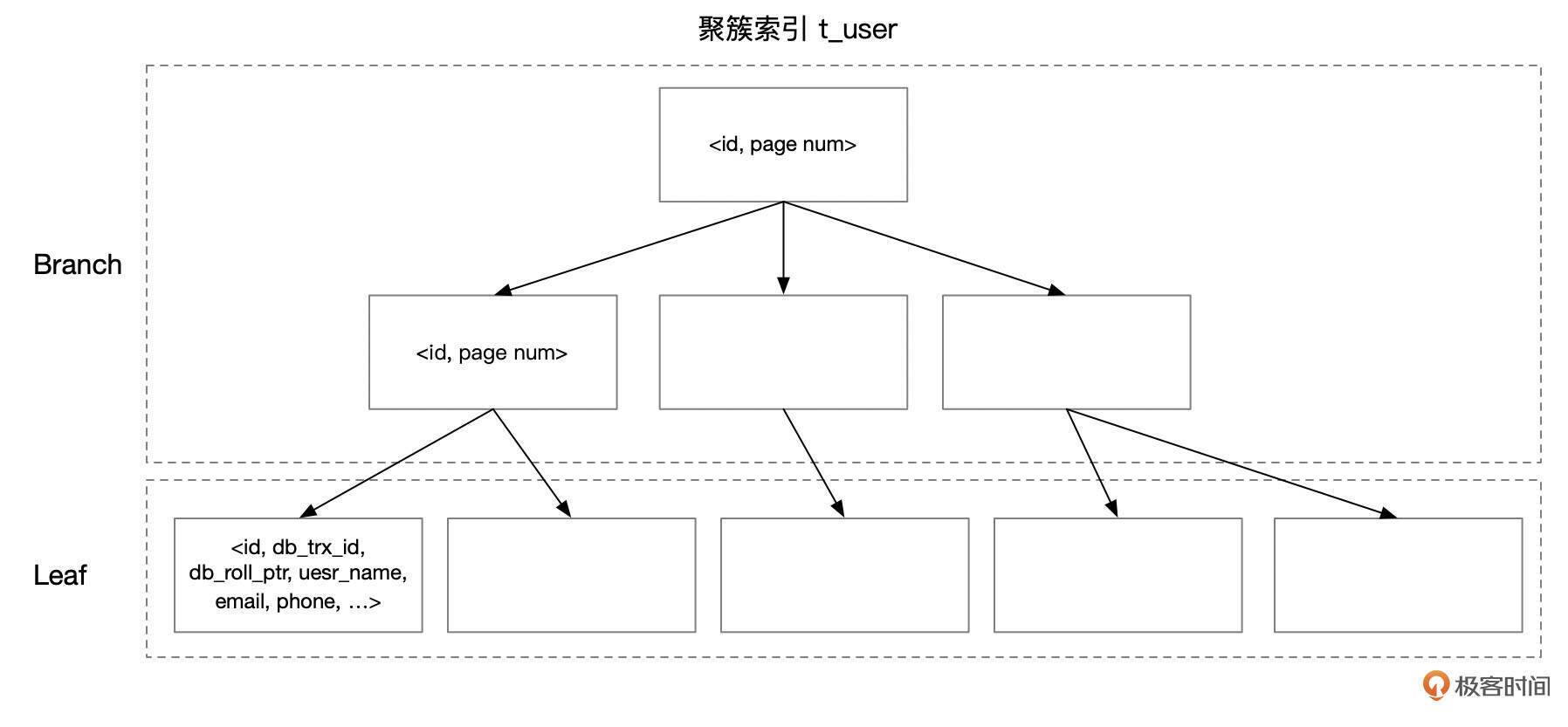 下面是聚簇索引的一个示意图,分支页面中的索引条目为 (id, page num),叶子页面中,索引条目为 (id, db_trx_id, db_roll_ptr, user_name, …)。这里的 db_trx_id、db_roll_ptr 是InnoDB中的隐藏字段,后续的课程中还会详细介绍。