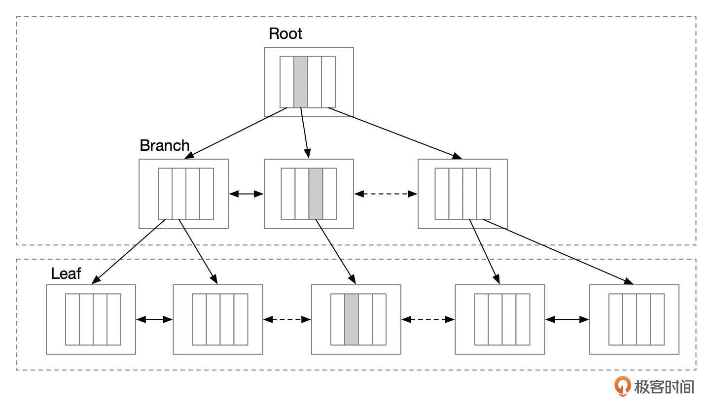 在上图展示的3个相邻的叶子页面中,Page i中的记录总是小于Page j中的记录,Page j中的记录总是小于Page k中的记录,依次扫描i、j、k这3个页面得到的记录(Ki1,Ki2,…,Kj1,Kj2,…,Kk1,Kk2,…)已经是有序的。