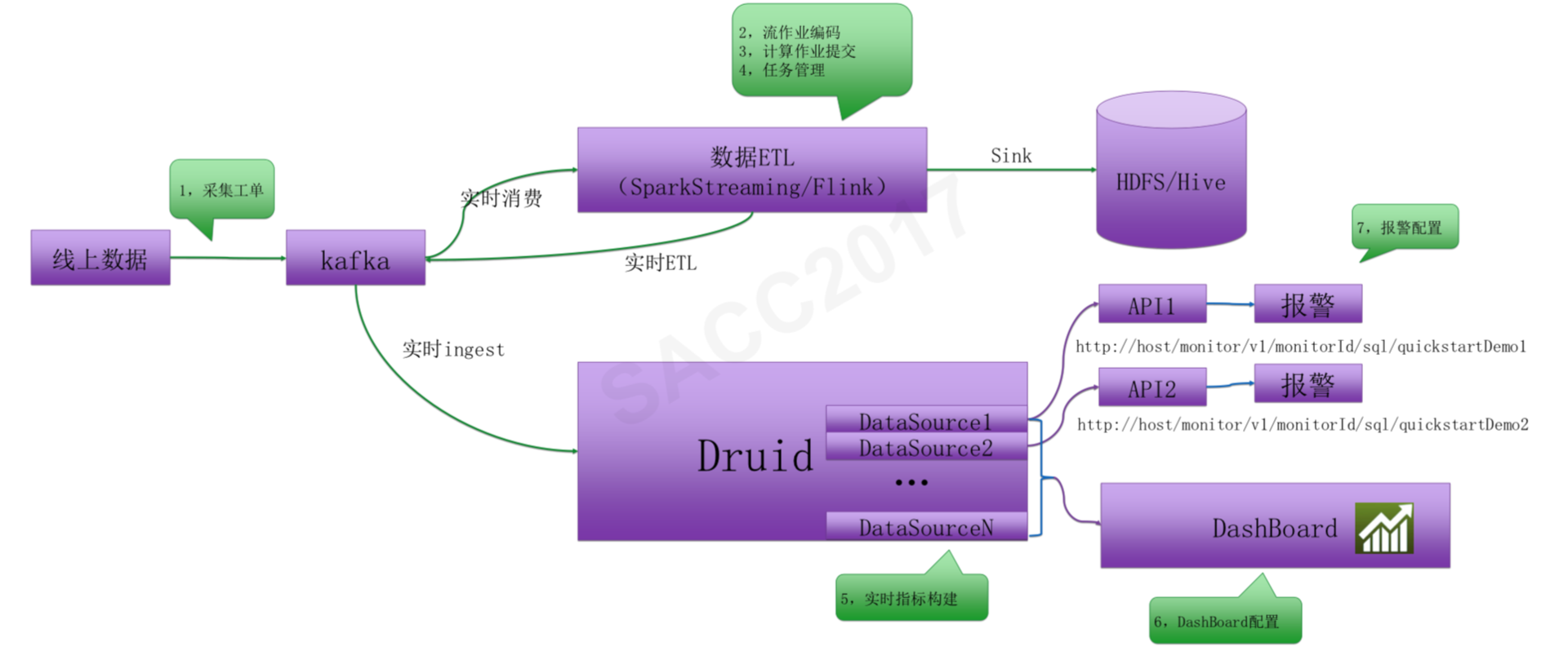 实时计算平台架构如下。数据采集以后输出到Kafka消息队列,消费通道有两个,一个是数据ETL,使用Spark Streaming或者Flink将数据进行清洗、转换、处理后记录到HDFS中,供后续批处理计算。另一个通道是Druid,计算实时监控指标,将结果输出到报警系统和实时图表系统DashBoard。