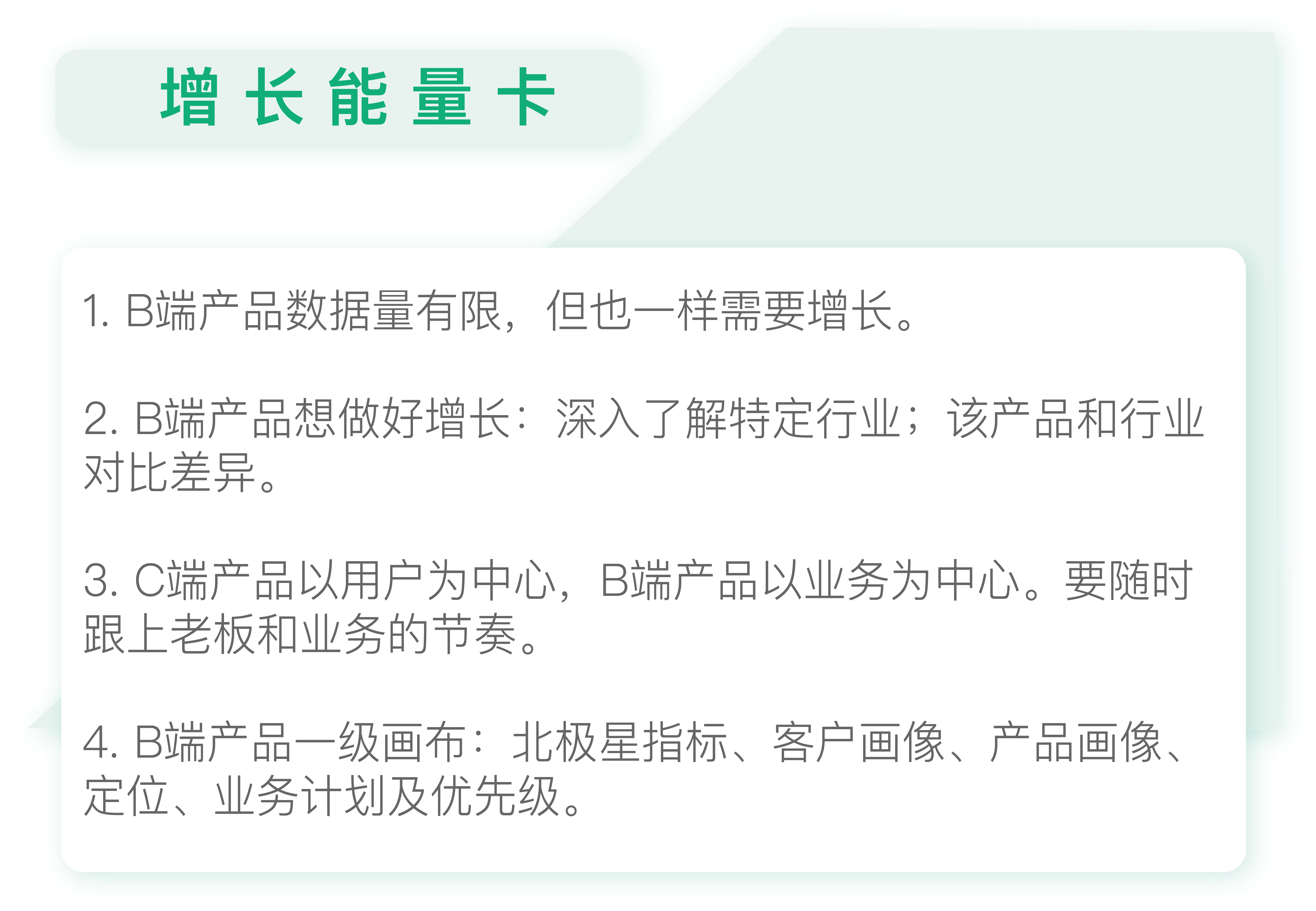 增长不仅仅是数据的增长。数据只是衡量增长的一种手段而已。实际上任何和企业价值有关的事情都是增长。所以,即便产品初创期没有什么数据、即便B端产品数据量不多,我们也一样需要增长。