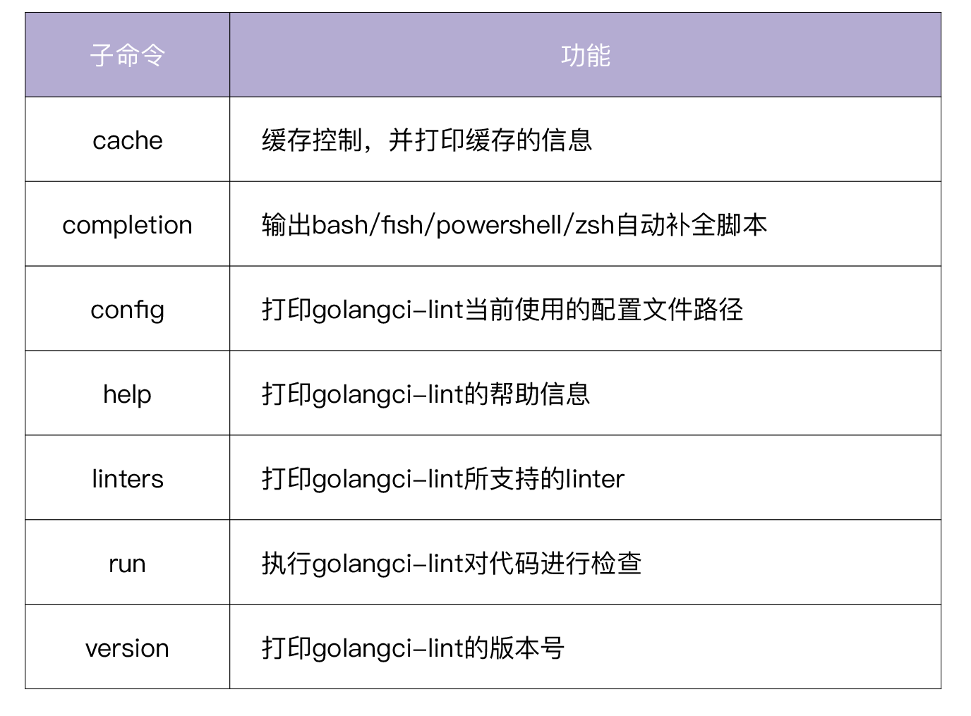 安装之后,就可以使用了。我们可以通过执行 golangci-lint -h 查看其用法,golangci-lint支持的子命令见下表: