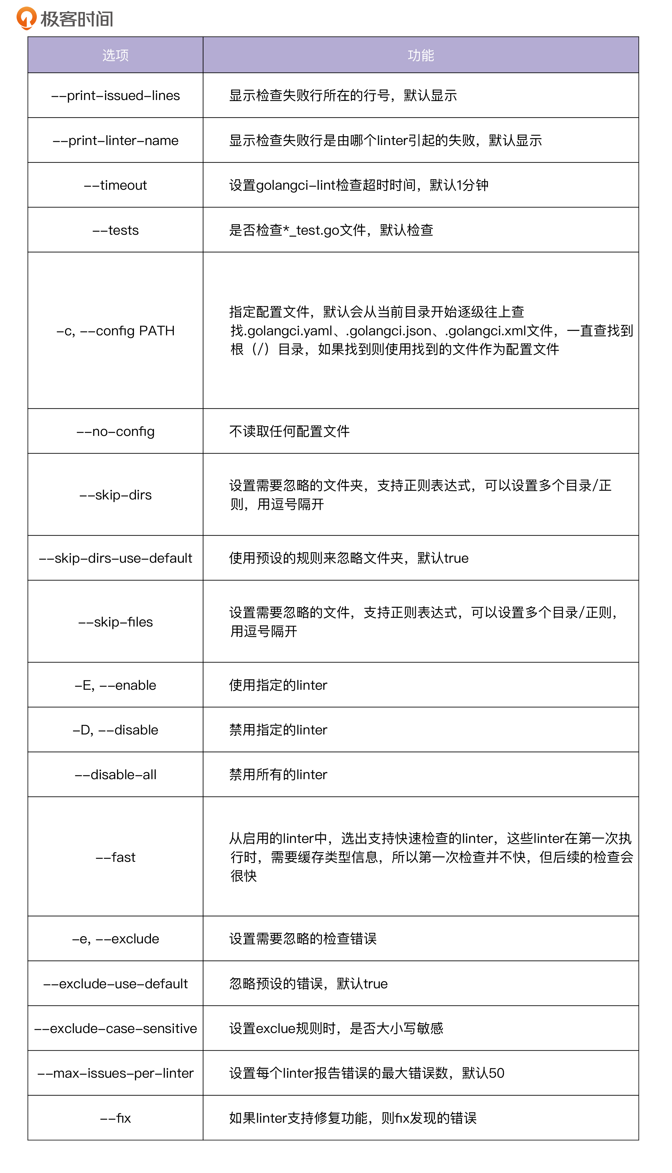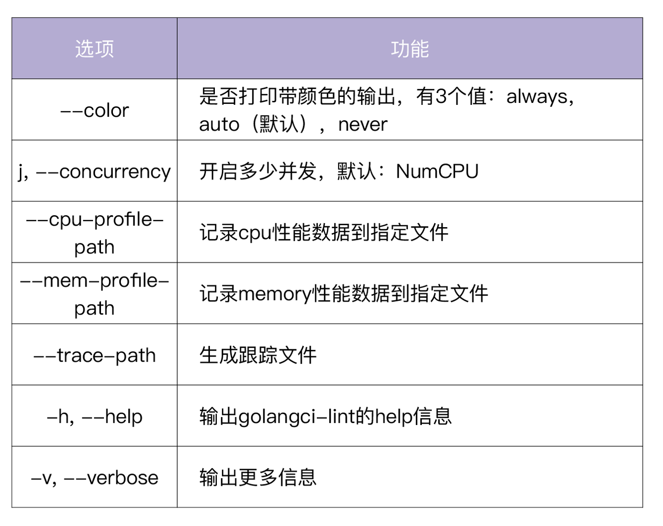golangci-lint run 支持很多命令行选项,可通过golangci-lint run -h查看,这里选择一些比较重要的选项进行介绍,见下表: