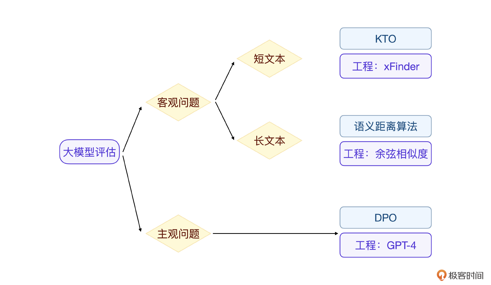 对于主观问题,例如写作类任务,倾向性评估更为适合。可以使用DPO或RLHF等方法,通过比较多个模型输出,选择最符合预期的答案。这类问题的评估主观性较强,因而需要更复杂的评估算法来模拟专家评估的过程。在工程实战中,往往采用比训练的大模型更强的大模型来做这类问题的评估专家,效果也足够好。