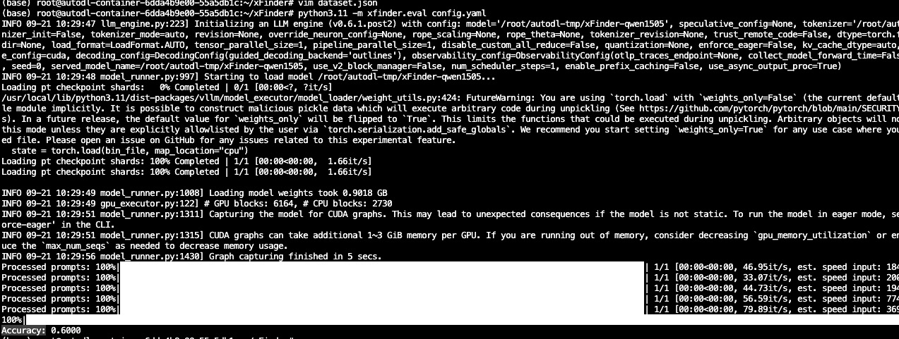 最后运行xfinder评估脚本,使用以下命令运行 xFinder 对 LLM 输出进行评估。