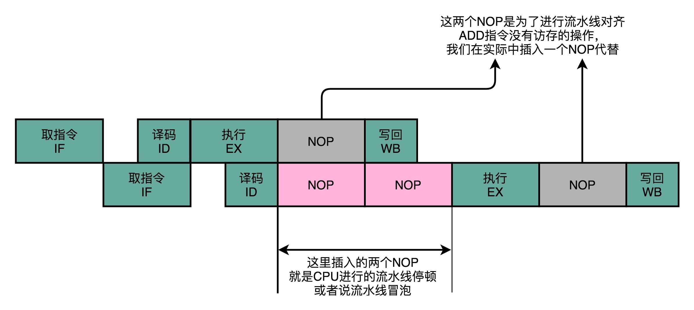 所以,在实践当中,各个指令不需要的阶段,并不会直接跳过,而是会运行一次NOP操作。通过插入一个NOP操作,我们可以使后一条指令的每一个Stage,一定不和前一条指令的同Stage在一个时钟周期执行。这样,就不会发生先后两个指令,在同一时钟周期竞争相同的资源,产生结构冒险了。