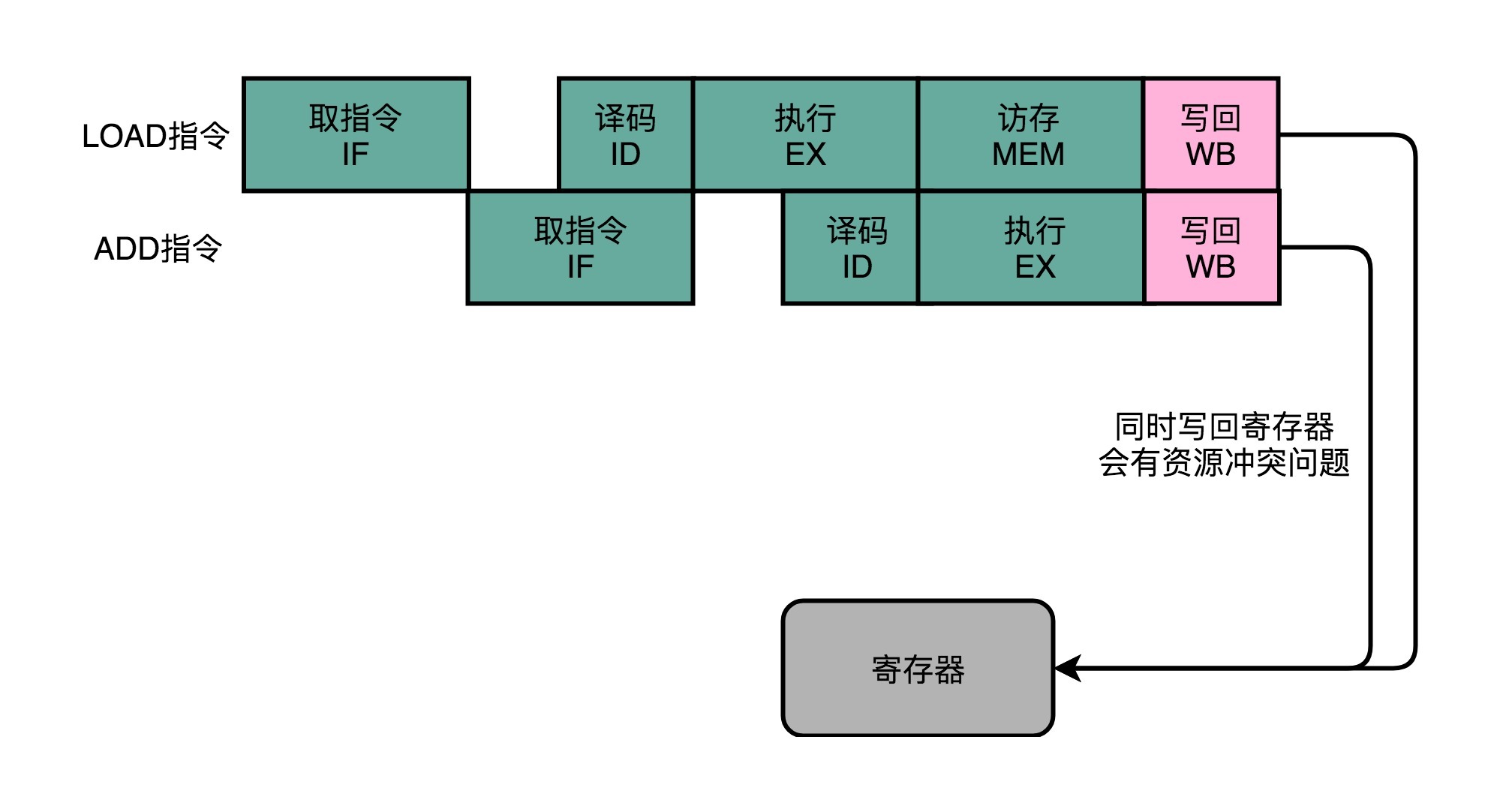 比如说,我们先去执行一条LOAD指令,再去执行ADD指令。LOAD指令在访存阶段才能把数据读取出来,所以下一条指令的执行阶段,需要在访存阶段完成之后,才能进行。