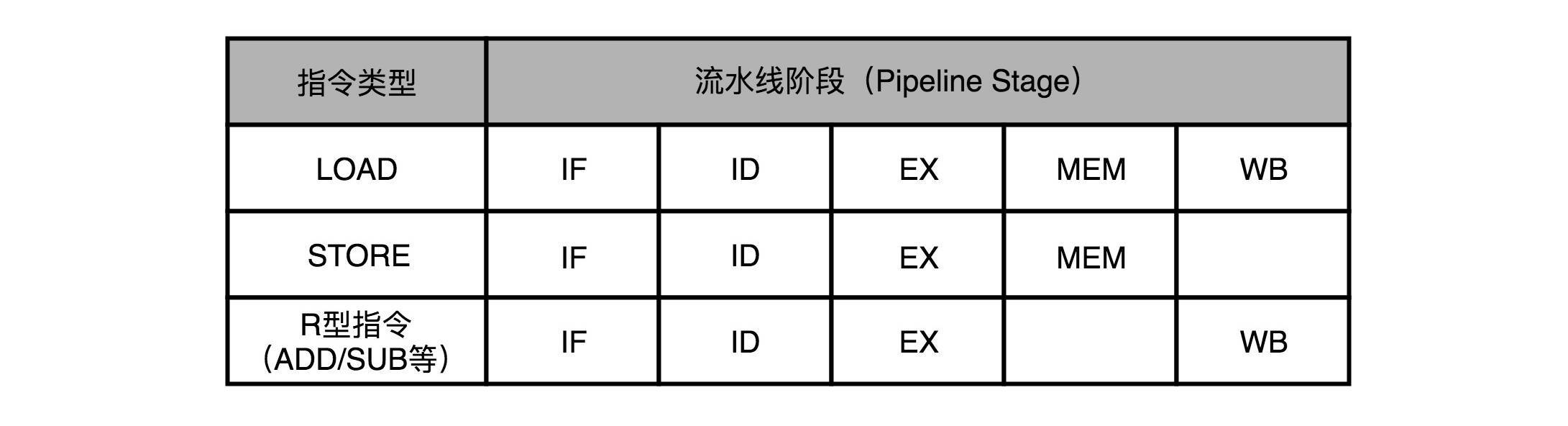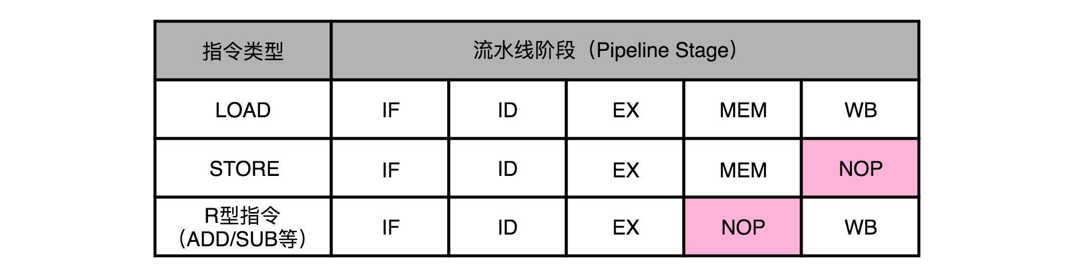 有些指令没有对应的流水线阶段,但是我们并不能跳过对应的阶段直接执行下一阶段。不然,如果我们先后执行一条LOAD指令和一条ADD指令,就会发生LOAD指令的WB阶段和ADD指令的WB阶段,在同一个时钟周期发生。这样,相当于触发了一个结构冒险事件,产生了资源竞争。