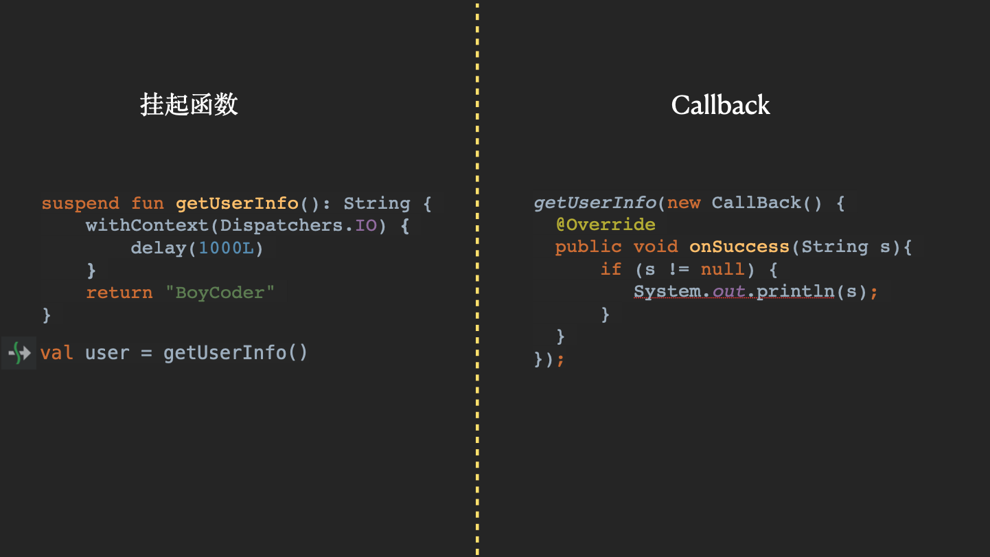 看,Kotlin官方要将CallBack命名为Continuation的原因也出来了:Continuation道出了它的实现原理。当然,为了理解挂起函数,我们用CallBack会更加简明易懂。