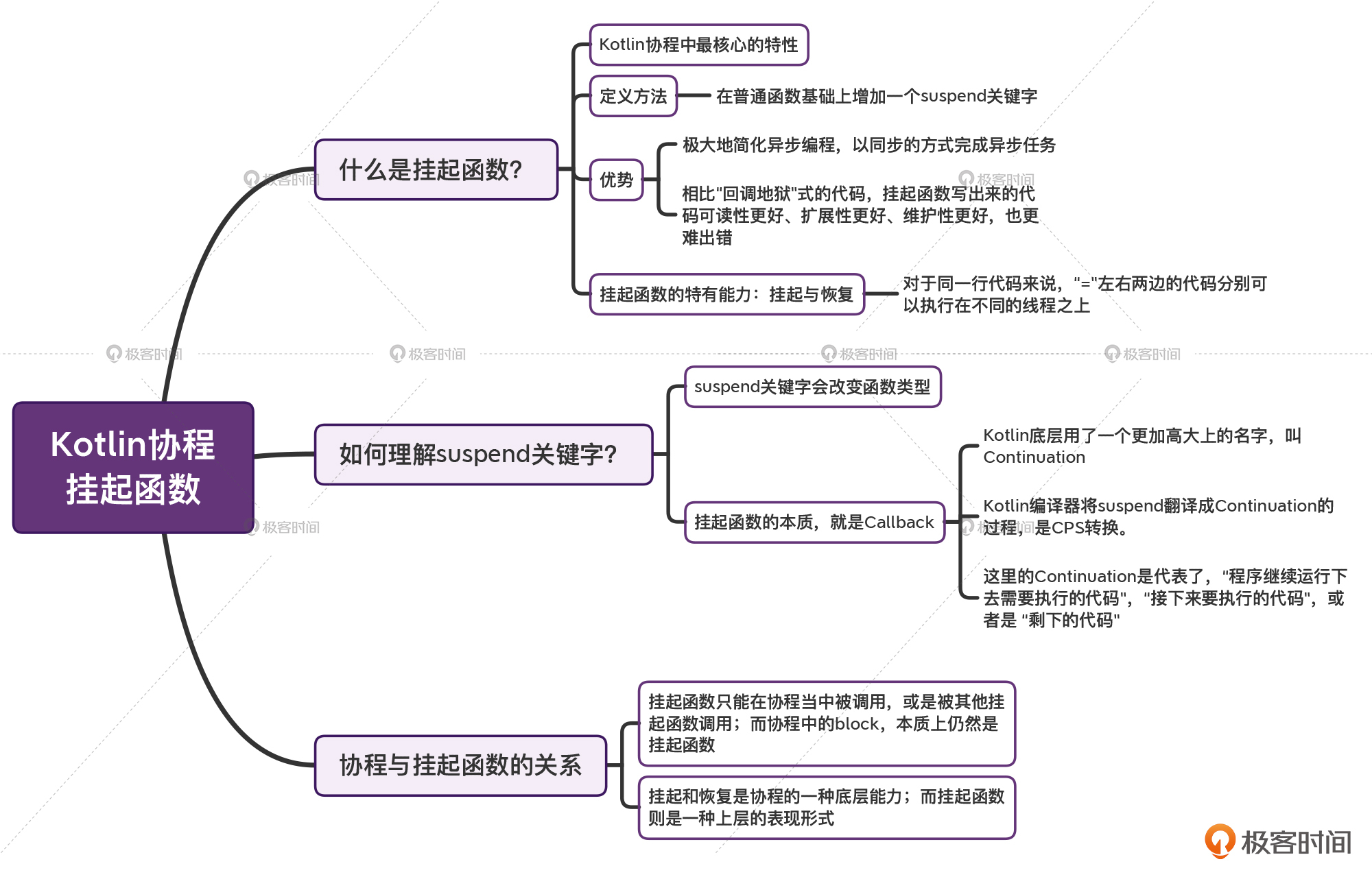 以上就是Kotlin挂起函数的核心原理,它的挂起和恢复,其实也是通过CPS转换来实现的。在后面学习源码篇的时候,我们还会继续跟Continuation继续打交道。现在我们看着CPS的过程好像很简单,等到深入底层的时候,你会发现Continuation是多么的复杂和精妙。