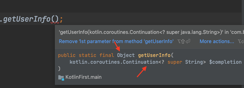 而这就意味着,如果你在Java中访问一个Kotlin挂起函数getUserInfo(),会看到Java里的getUserInfo()的类型是“(Continuation)-> Object”(即接收Continuation为参数,返回值是Object)。