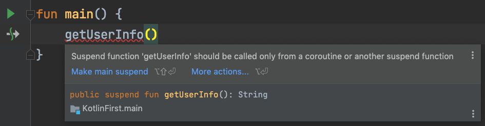 在上面的代码中,我们直接在main函数当中调用了getUserInfo()这个挂起函数,这时候,我们发现IDE会报错,报错的具体内容是这样的: