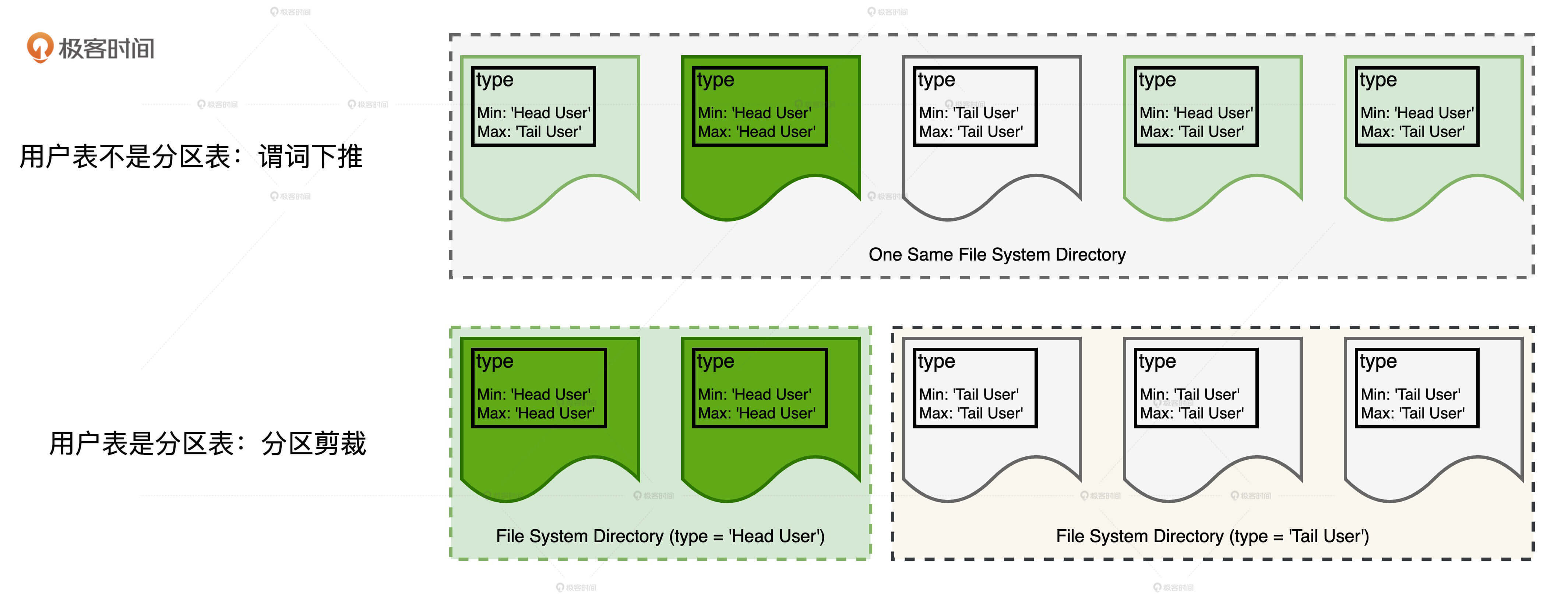 这是因为,谓词下推操作往往是根据文件注脚中的统计信息完成对文件的过滤,过滤效果取决于文件中内容的“纯度”。分区剪裁则不同,它的分区表可以把包含不同内容的文件,隔离到不同的文件系统目录下。这样一来,包含分区键的过滤条件能够以文件系统目录为粒度对磁盘文件进行过滤,从而大幅提升磁盘访问的I/O效率。