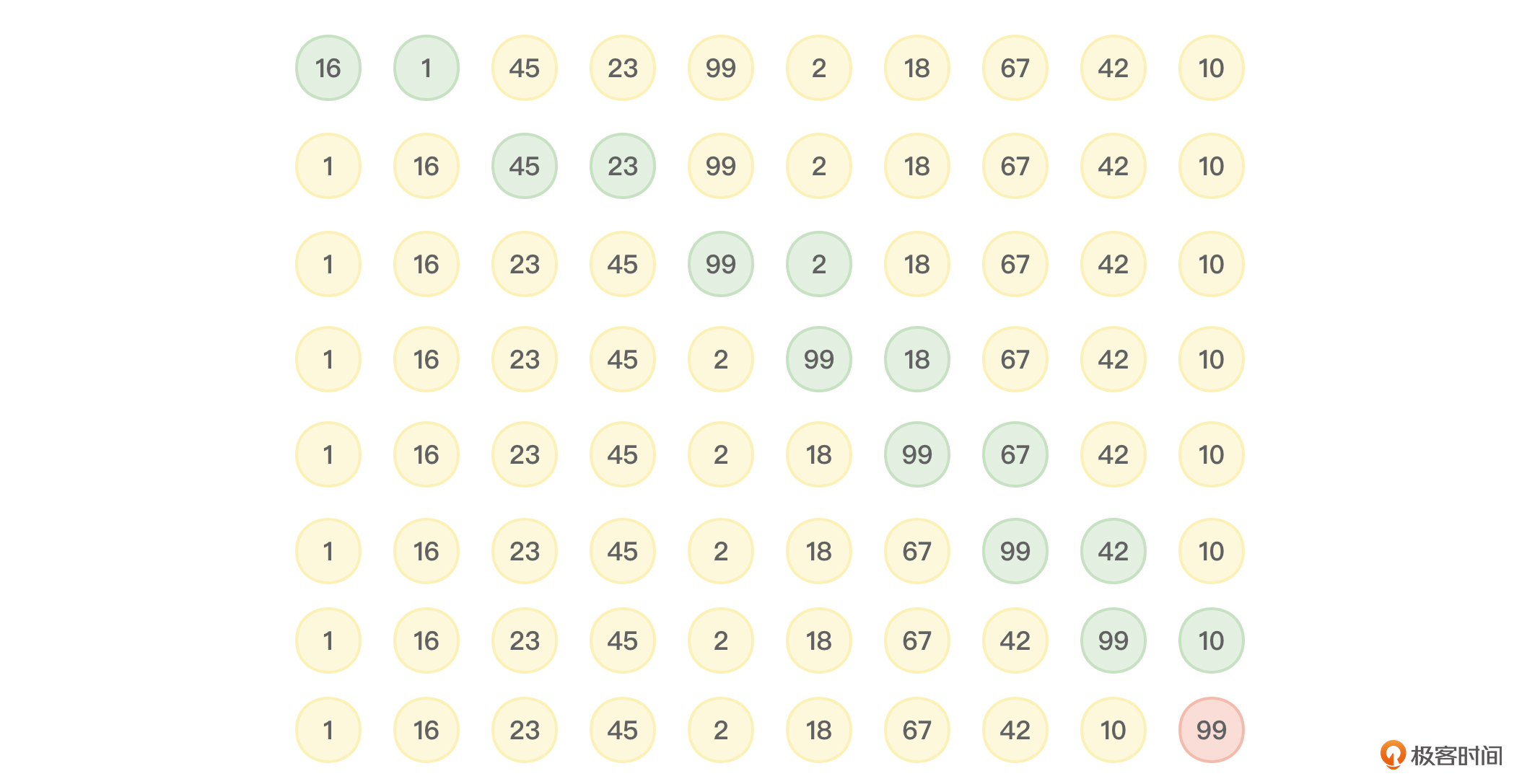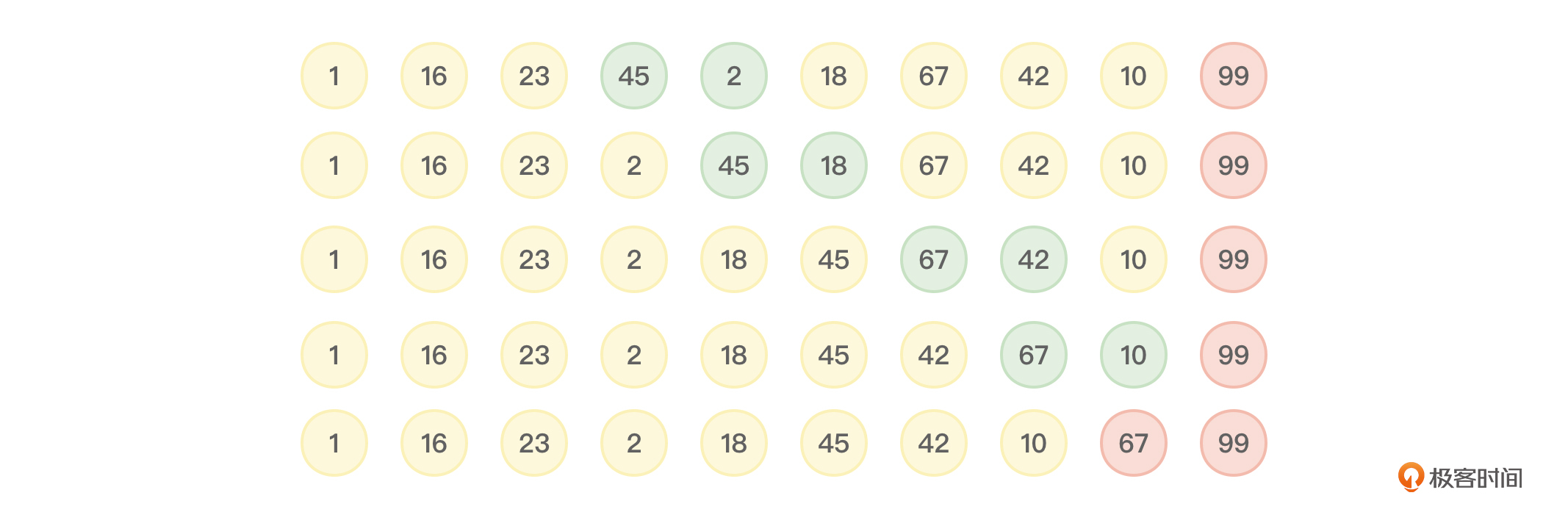 冒泡排序会进行多趟排序,每趟排序都会把当前参与排序的数字中的最大数字下沉到最后,当然,不能影响已经在最后面的排好序的数字。