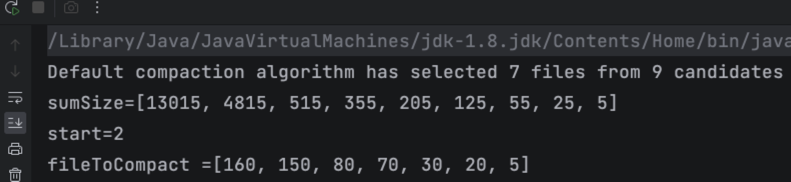 - 遍历L,从旧到新文件,逐一判断文件大小是否满足 L[i].fileSizes() > Math.max(C, (X[i + 1] * R)) ,当条件不满足后,i即为待合并的文件开始位置,该步骤是为了过滤掉大的文件,此处得到i=2,因为L[2].fileSize()=160 < 355*1.2。