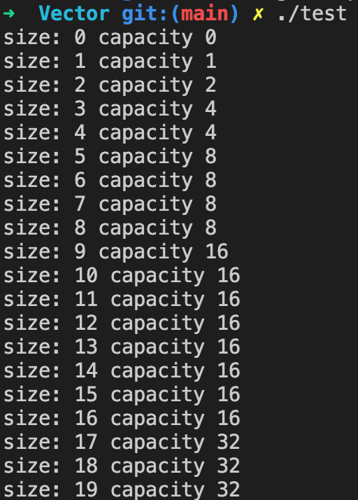 通过实验我们能发现一个很明显的规律:如果每次只插入一个元素,当vector的大小小于容量时,容量不会发生变化,数组大小不断递增。而当vector的大小即将超过容量的时候,插入之后,容量大小会翻番。