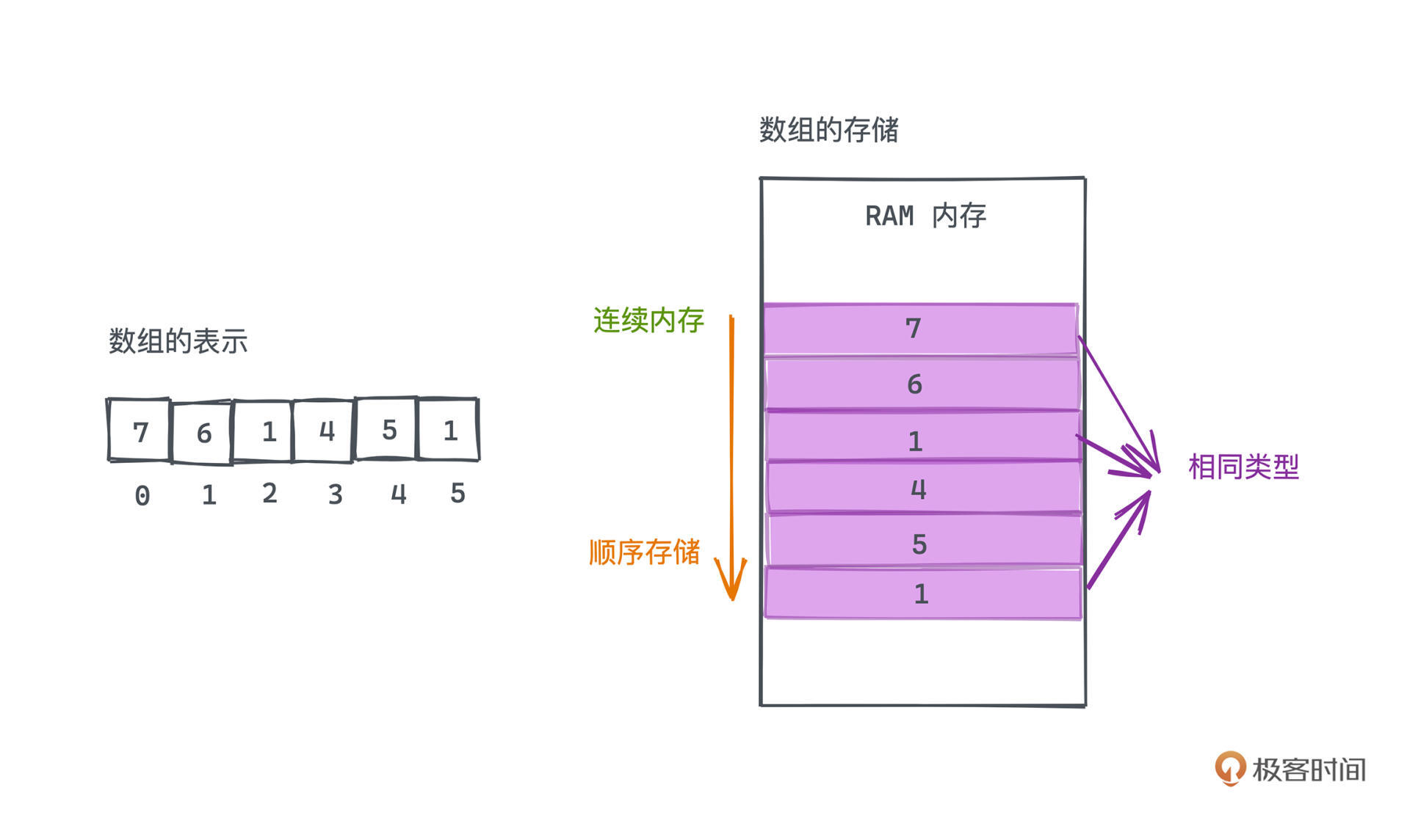 存储数组时,会事先分配一段连续的内存空间,将数组元素依次存入内存。因为数组元素的类型都是一样的,所以每个元素占用的空间大小也是一样的,这样我们就很容易用“数组的开始地址+index*元素大小”的计算方式,快速定位到指定索引位置的元素,这也是数组基于下标随机访问的复杂度为O(1)的原因。