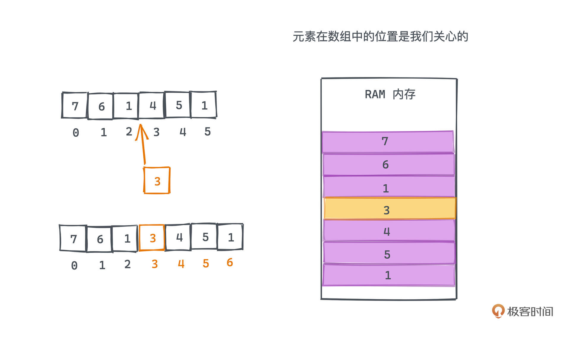 当然,在内存里这样的顺序存储也不是没有代价,这直接导致了数组的插入和删除会低效很多,平均的复杂度是O(N)。因为数组,和集合不同,元素在数组中的位置是我们关心的。