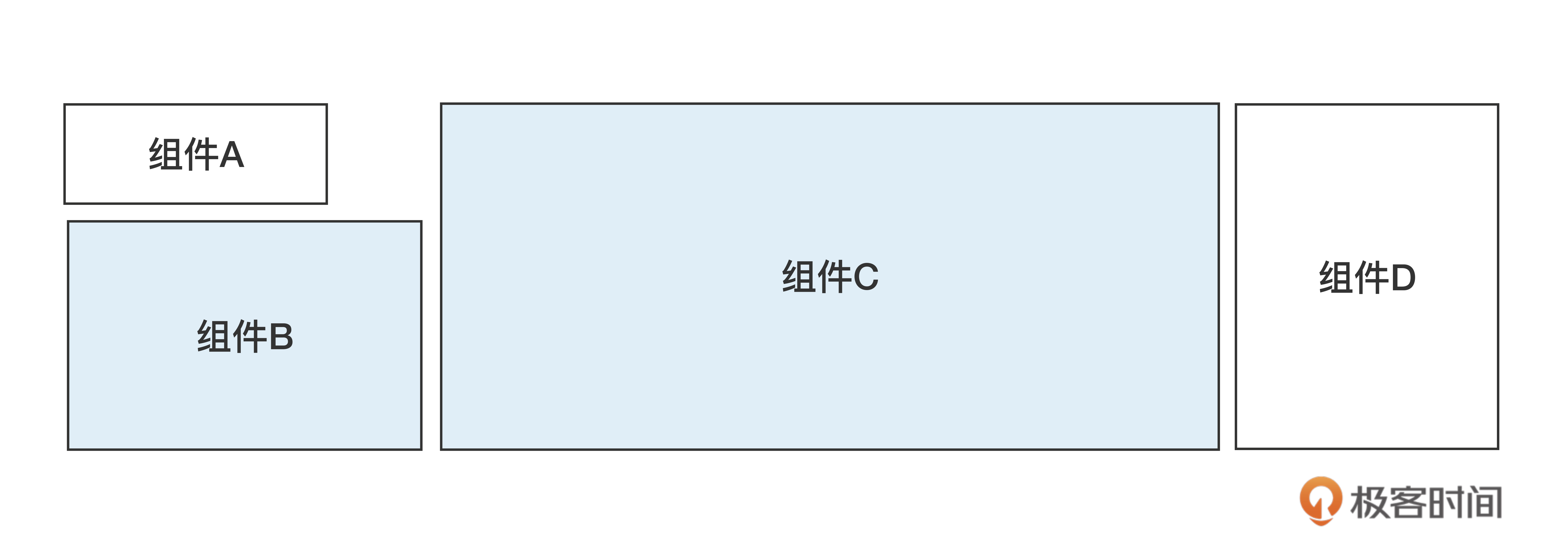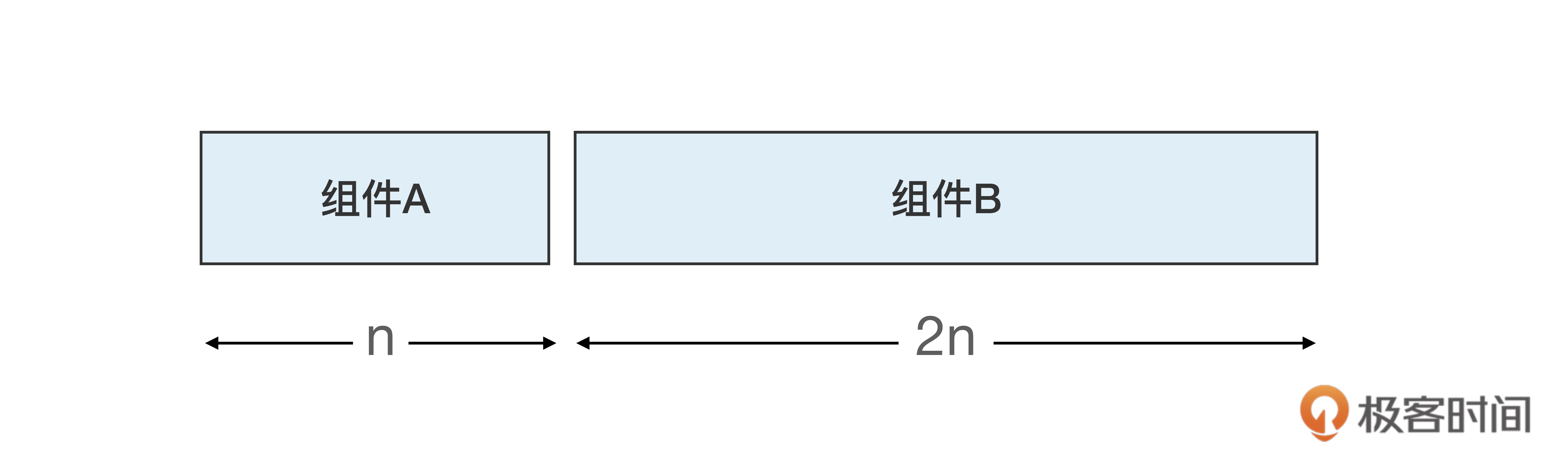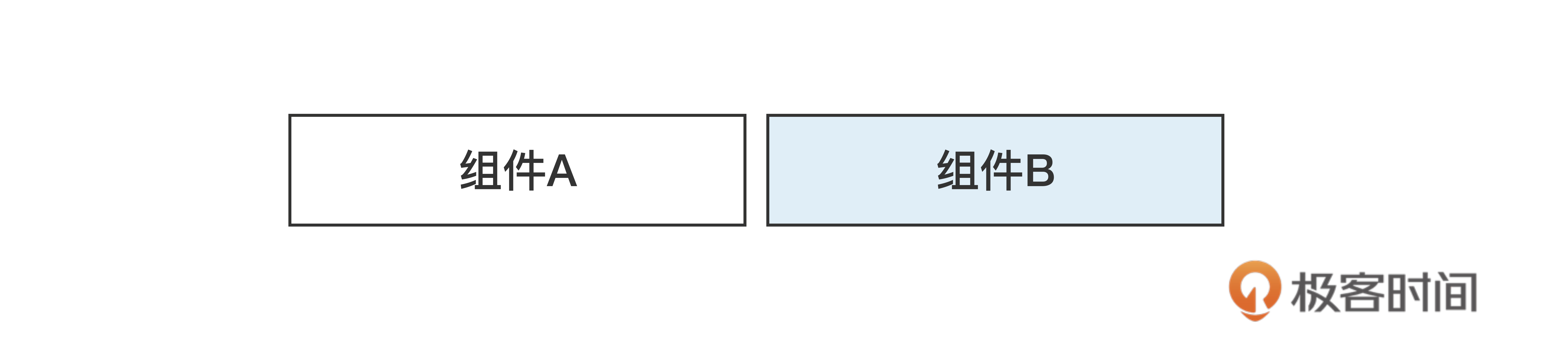 那么在实际运行时我们希望是什么样的结果呢?很容易想到的合理结果是,浏览器会将宽度先分配给组件A,然后将剩余的宽度全部分配给组件B。注意,组件A该多大就多大,而组件B在实际运行时有可能比上图看上去更大或者更小,甚至被完全压扁,这完全取决于浏览器的实际宽度。当有多个固定尺寸的组件和一个有弹性的组件在一行上,处理方式等价于这个情况。