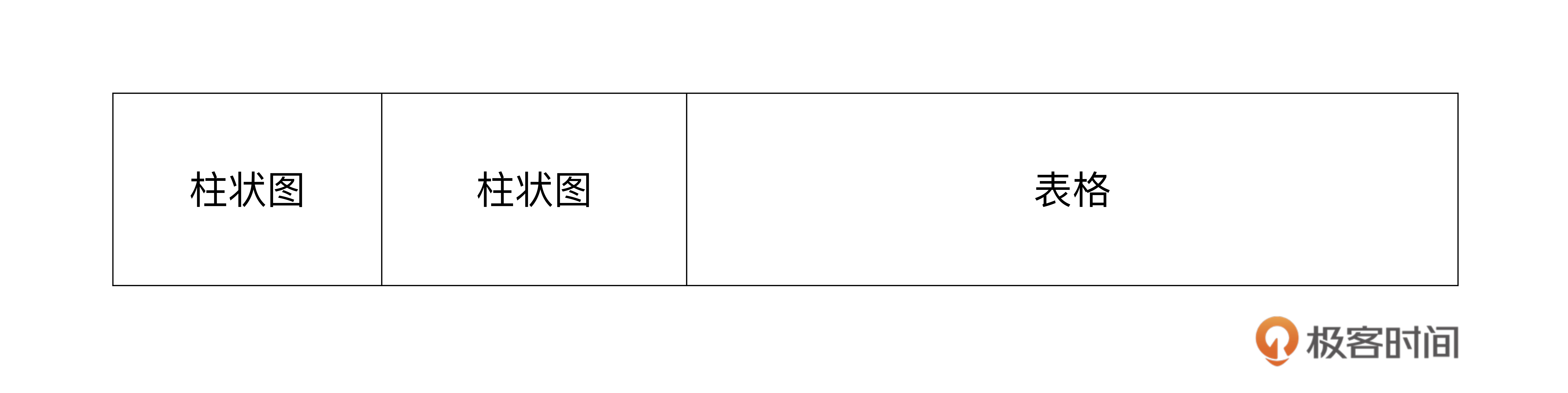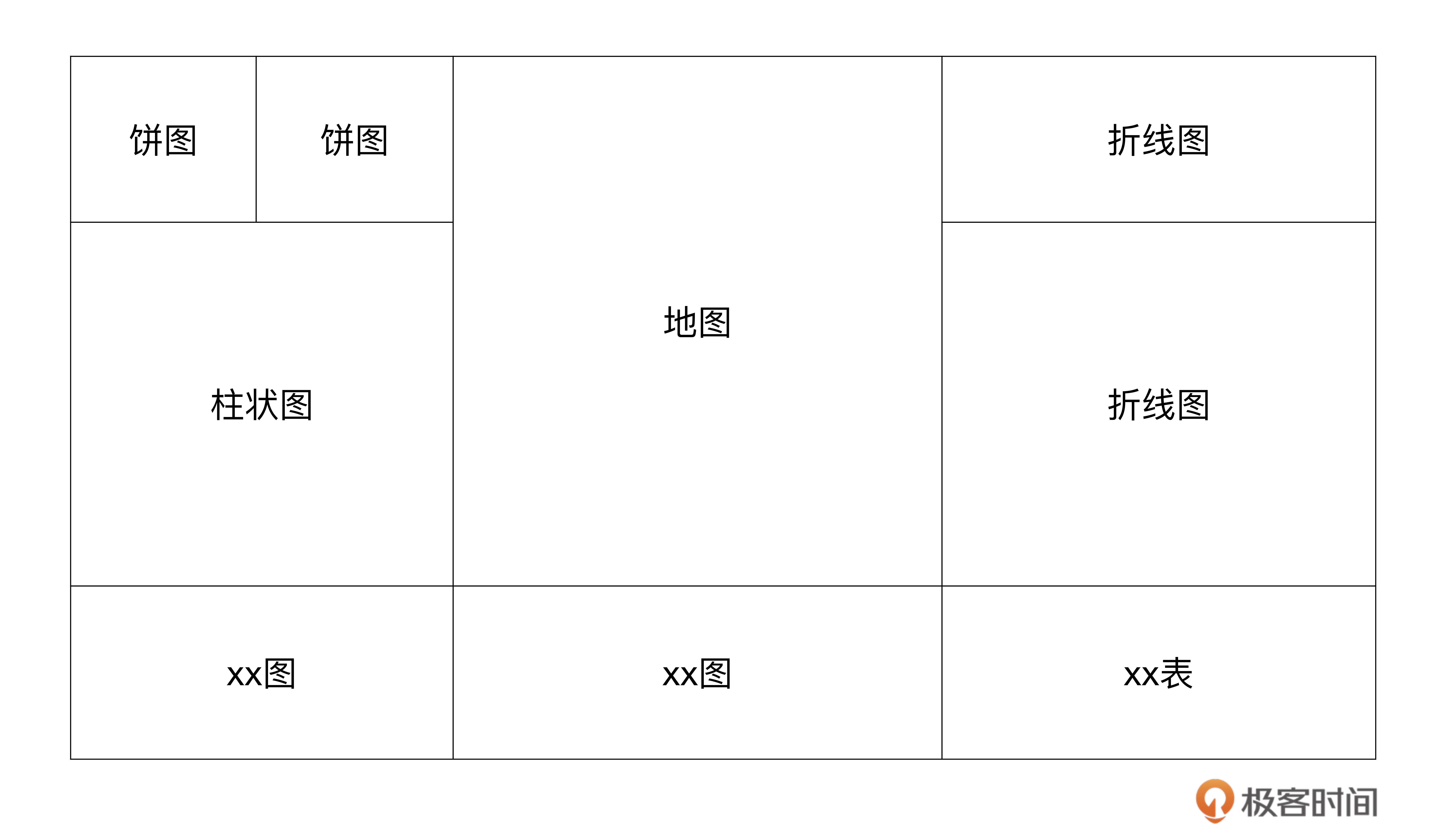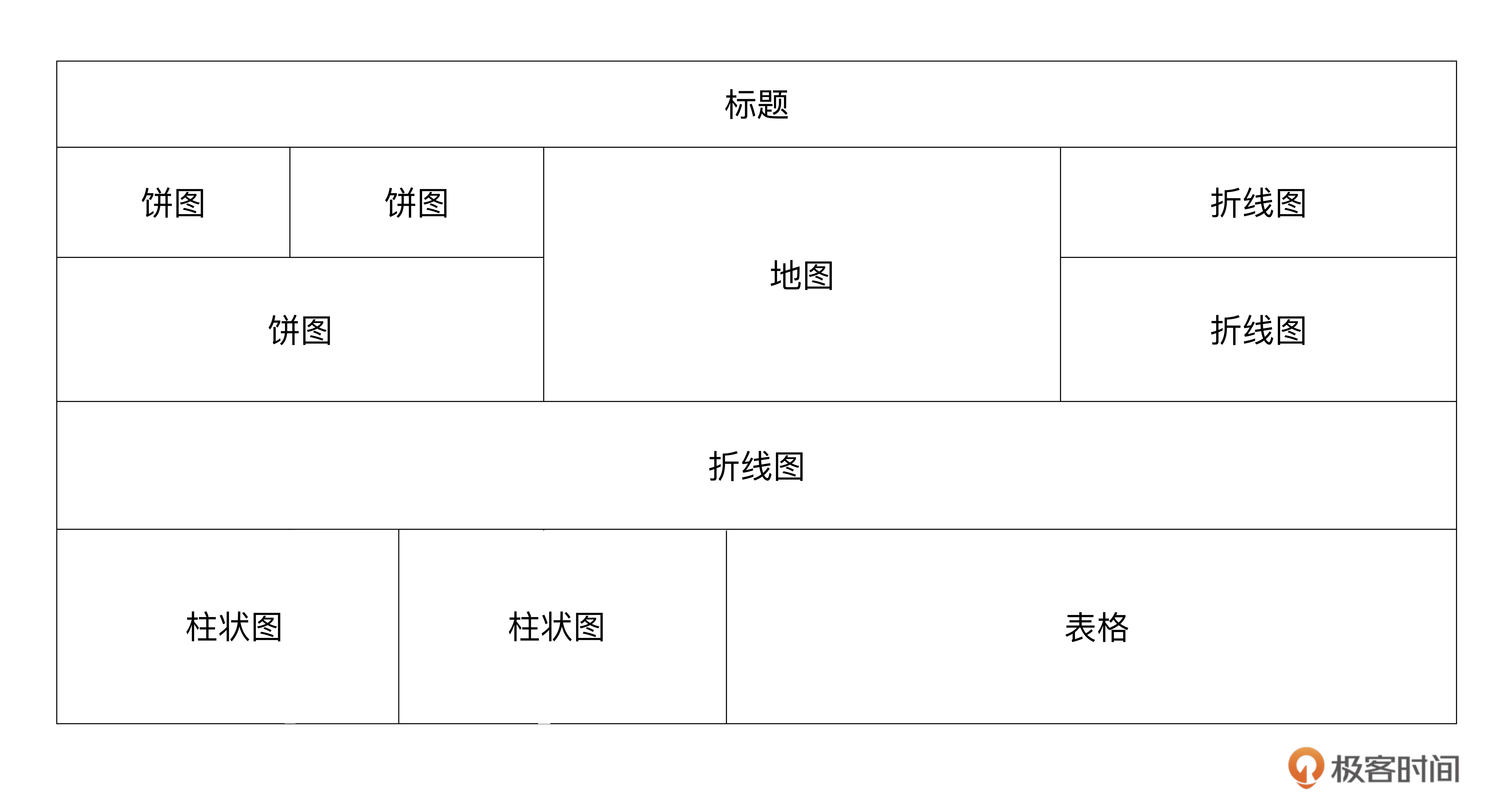 不过,有一类应用却恰好要求水平和垂直方向都具有完全弹性,那就是大屏类页面。这讲开头给的示意效果图,就是一个典型的大屏的例子。如果大屏类的页面是你的低代码平台的输出类型之一,那么前面的2个原则就可以同时应用到垂直方向上,用于输出大屏类页面布局。