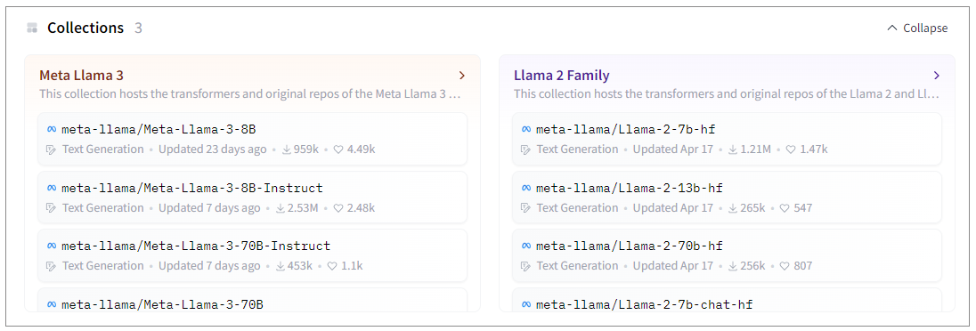 Hugging Face 上面有两个8B版本的模型供选择。其中,后缀为Instruct的是Llama 3 指令微调模型,也就是针对对话用例进行了优化,在常见的行业基准上优于许多可用的开源聊天模型。我们可以选择这个模型。