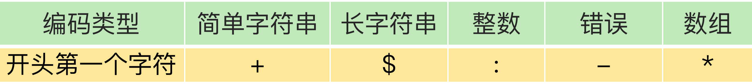 - 为了对不同类型的交互内容进行编码,RESP 2协议实现了5种编码格式类型。同时,为了区分这5种编码类型,RESP 2使用一个专门的字符,作为每种编码类型的开头字符。这样一来,客户端或服务器端在对编码后的数据进行解析时,就可以直接通过开头字符知道当前解析的编码类型。