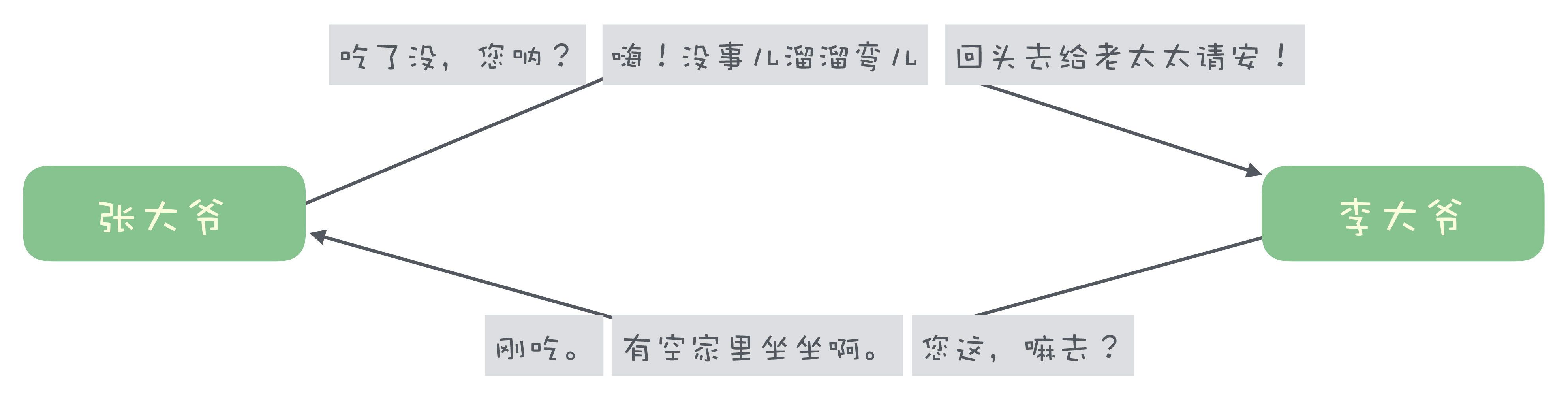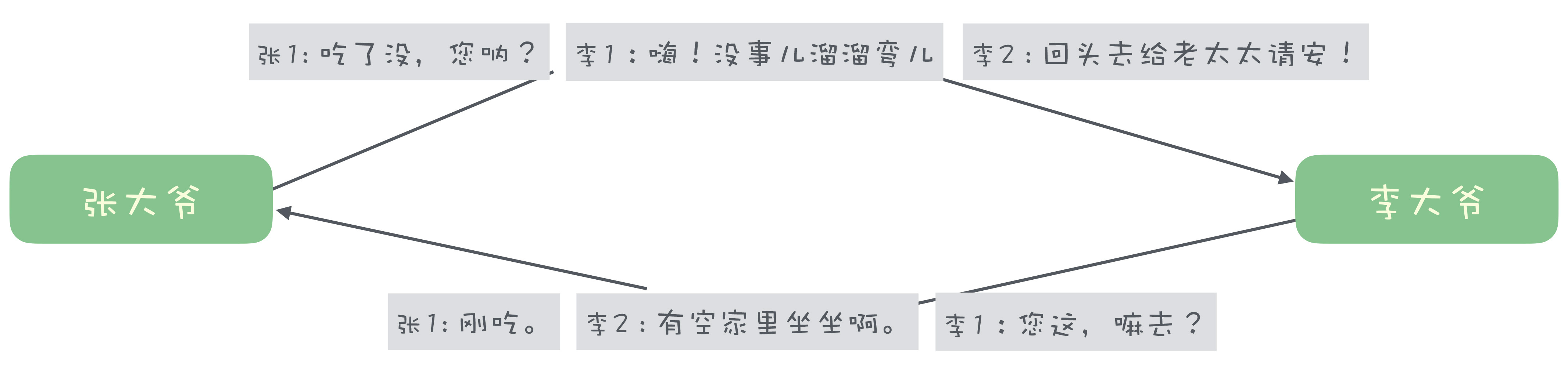 单工通信时,一句对一句,请求和响应是按照顺序依次收发,有一个天然的对应关系。比如说,胡同口张大爷和李大爷俩大爷碰上了: