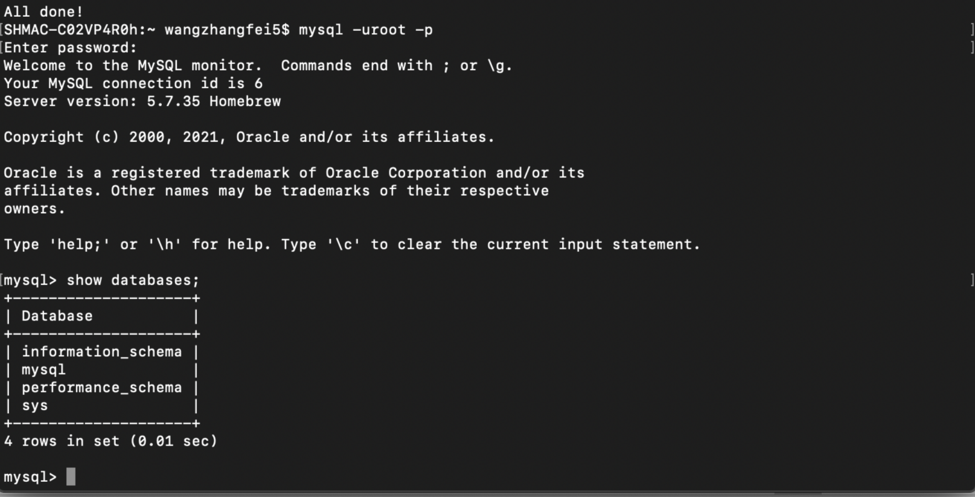 查看下当前的所有库,到这里也说明我们的MySQL准备好了,可以建库建表了。