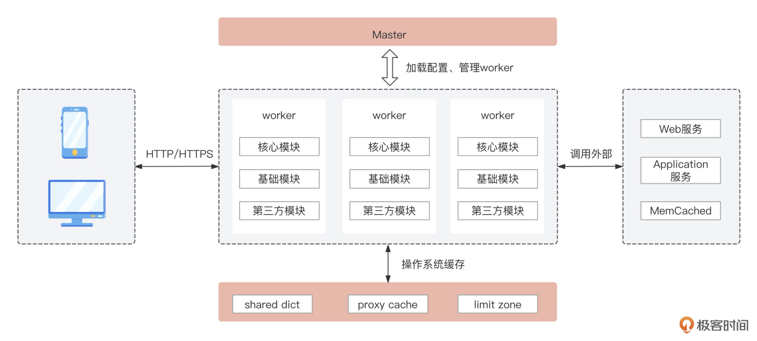 这里插一句,**为什么要用Lua语言来做Nginx开发呢?**这就要说到Lua语言的特点了,Lua的线程模型是单线程多协程的模式,而Nginx刚好是单进程单线程,天生的完美搭档。同时Lua是一种小巧的脚本语言,语法非常的简单,很容易学习掌握,所以对于新语言你先不要有排斥心理,我会在后面的课程中慢慢向你展示讲解。