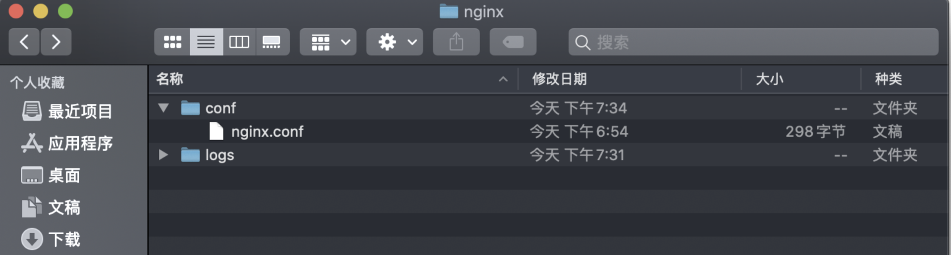 - 然后我们就可以测试下Nginx是否好用,所以我们在本地新建了个nginx.conf配置文件,就放在/Users/~/Documents/seckillproject/nginx/conf下,并且在nginx文件夹下新建logs文件夹,用于log日志的输出,新建后的文件目录结构如下: