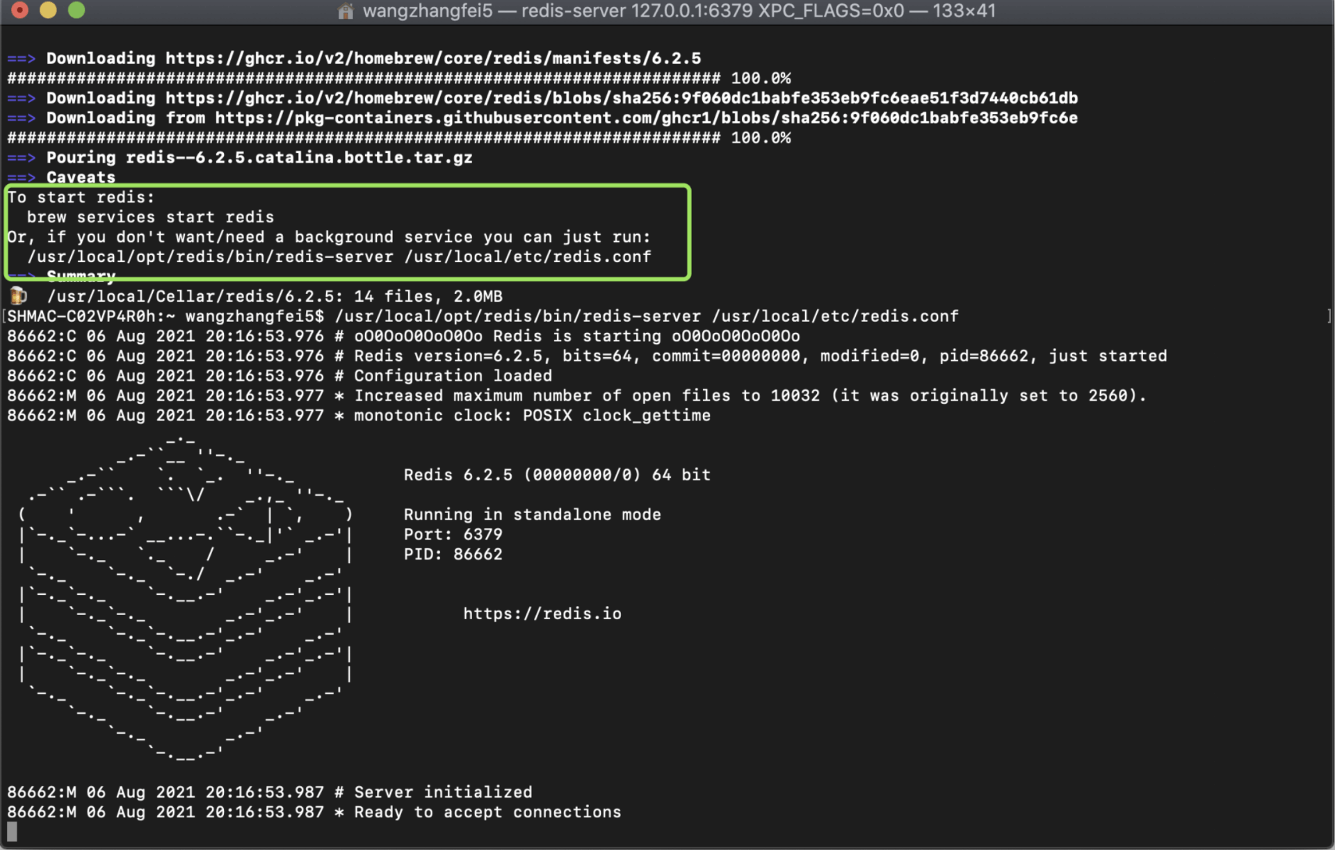 启动Redis服务端,如下图绿框,在安装好后提示我们如何启动Redis,按照提示输入命令,便可以看到启动成功等待连接。