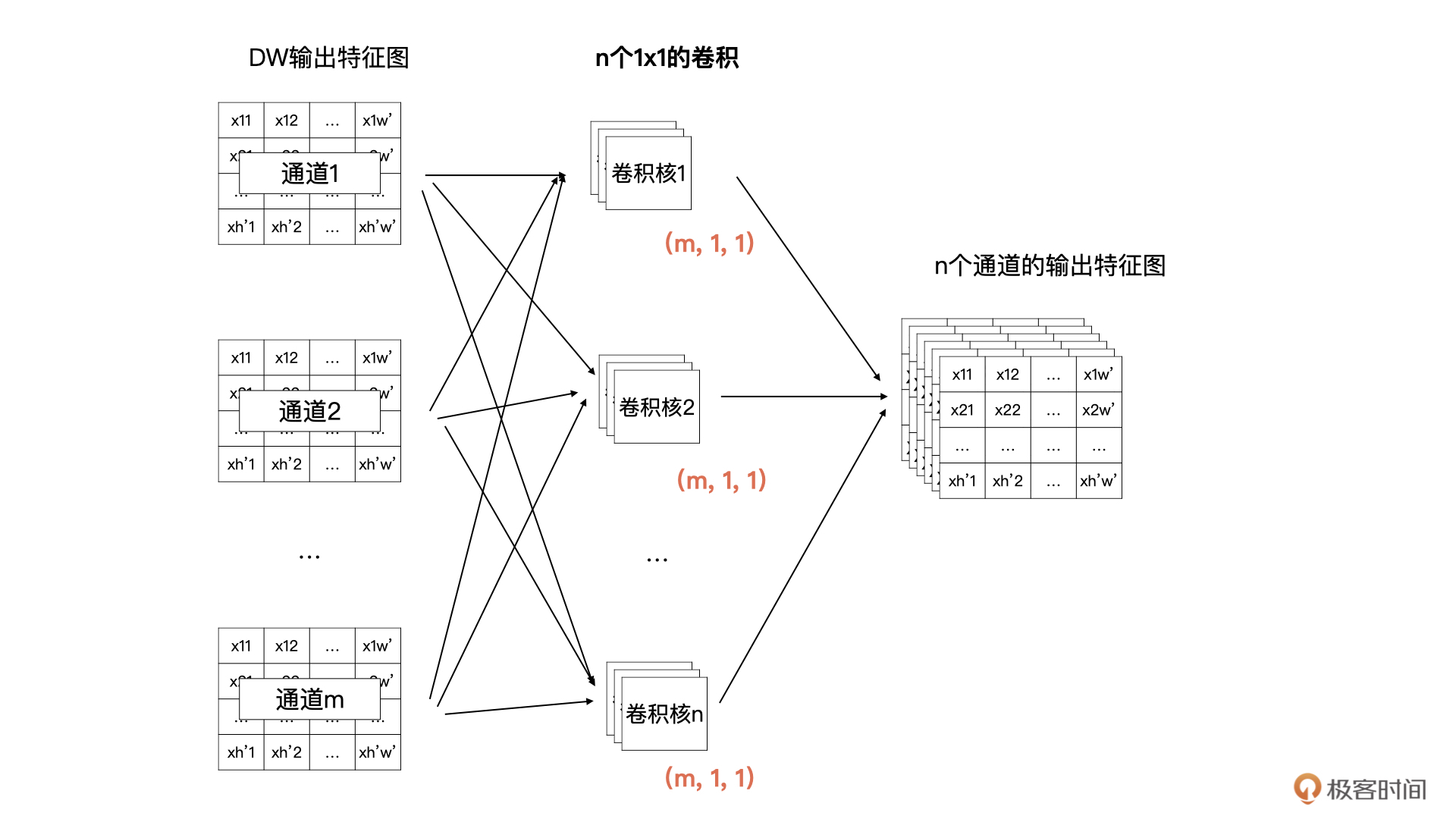你还记得下面这张图吗?这是我们上节课讲到的标准卷积计算方式,它描述的是:输入m个尺寸为h, w的特征图,通过卷积计算获得n个通道尺寸为$h^{\prime}$与$w^{\prime}$的特征图的计算过程。