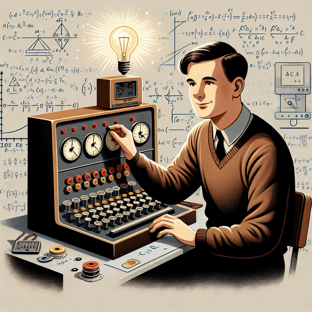黑白照片效果,年轻的艾伦·图灵正在专注地工作。他坐在办公桌前,桌上放着一台正在运行的早期计算机原型机,机器的电子管正在闪烁。图灵拿着一张写满复杂数学符号和流程图的纸,似乎在设计算法。他的目光睿智而专注,完全沉浸在对计算机科学的探索中。