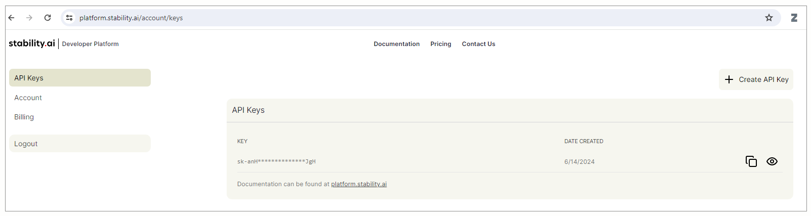 额外步骤:连接 Stable Diffusion API 类似地,我们也可以使用Python请求Stable Diffusion API。如果有兴趣,而且不介意付一点费,可以在这里 去申请一个API Key(网站在线生图免费,但是API要付费)。如果不想付费,也没有关系,看看我下面的步骤就好,这里只是为了展示不同的API调用方式。